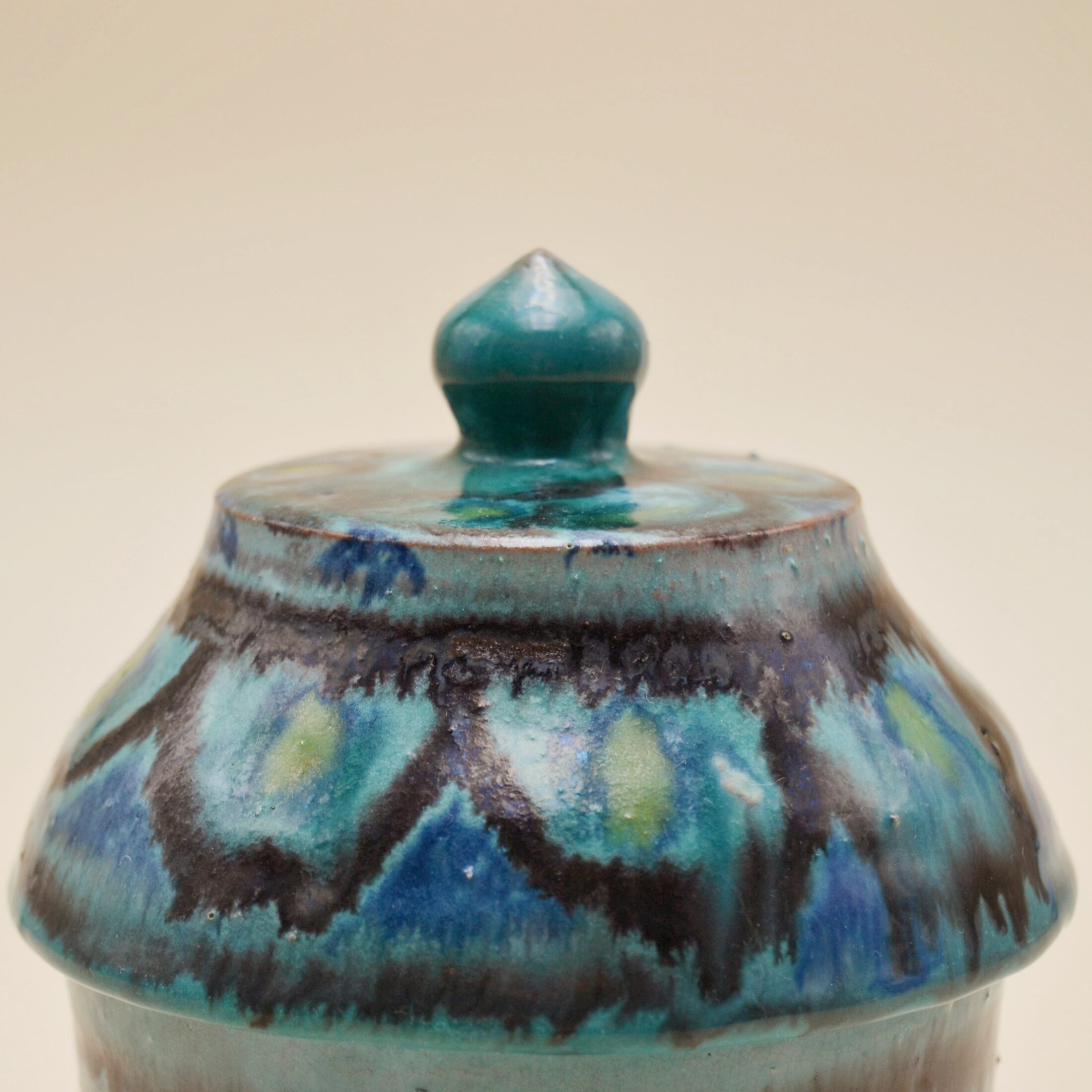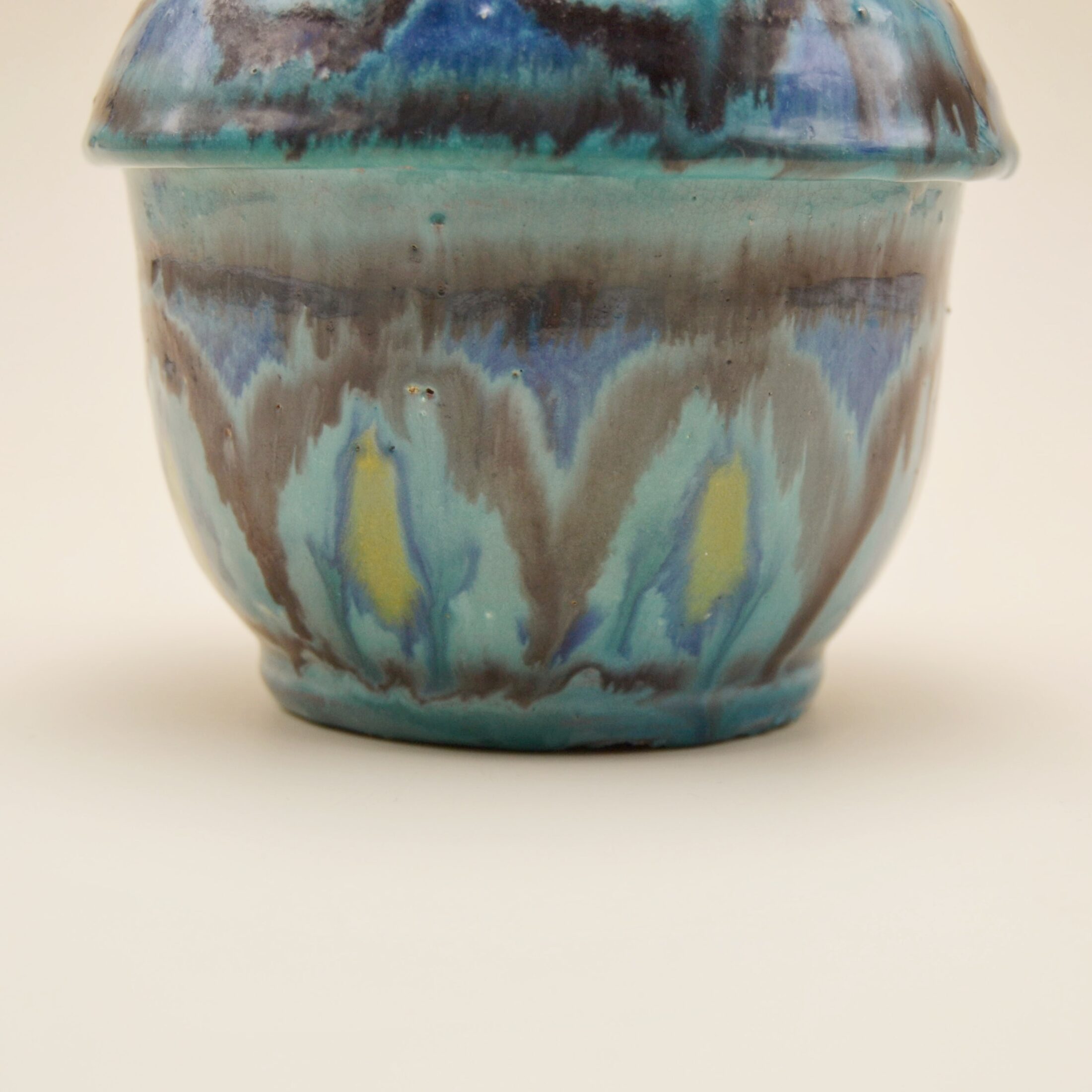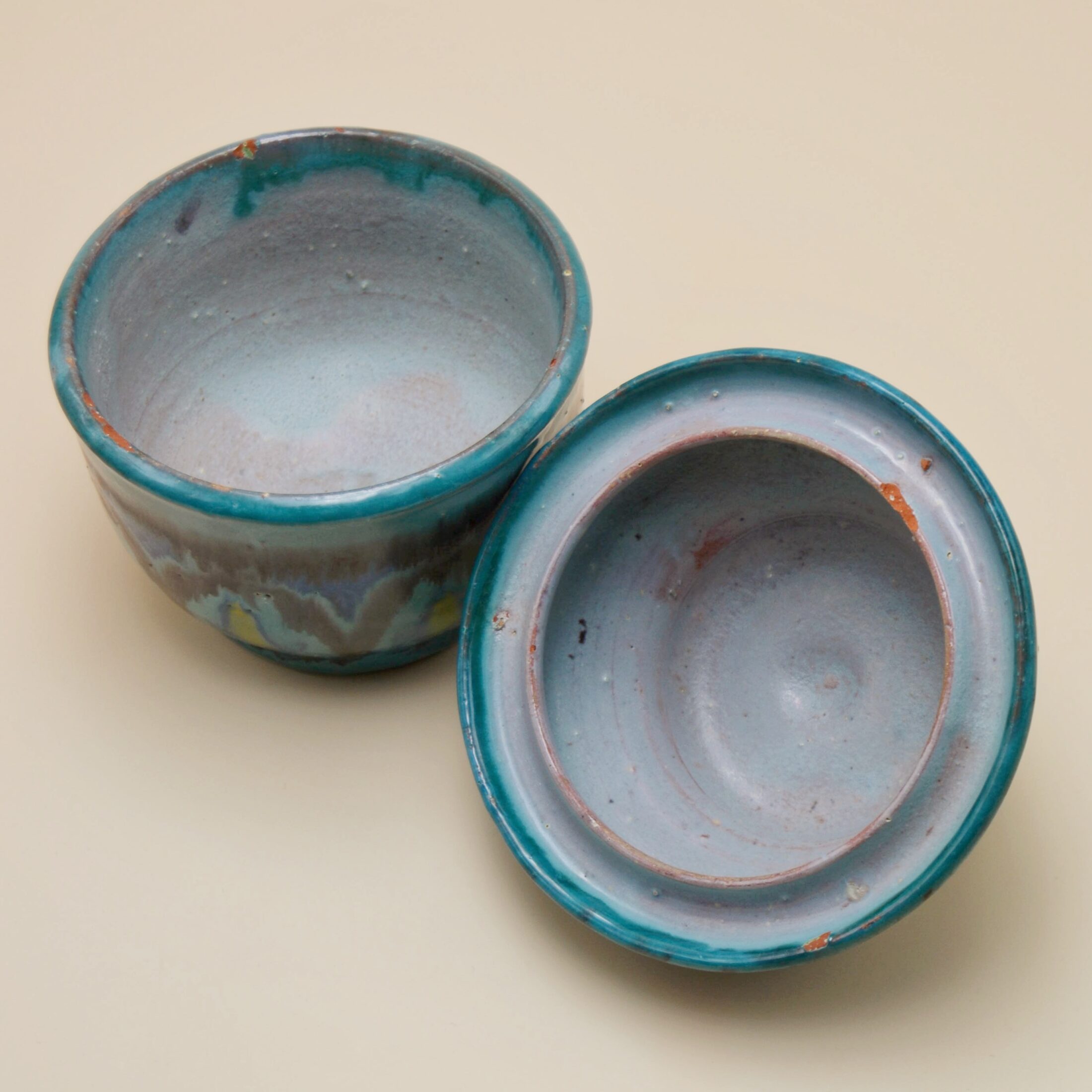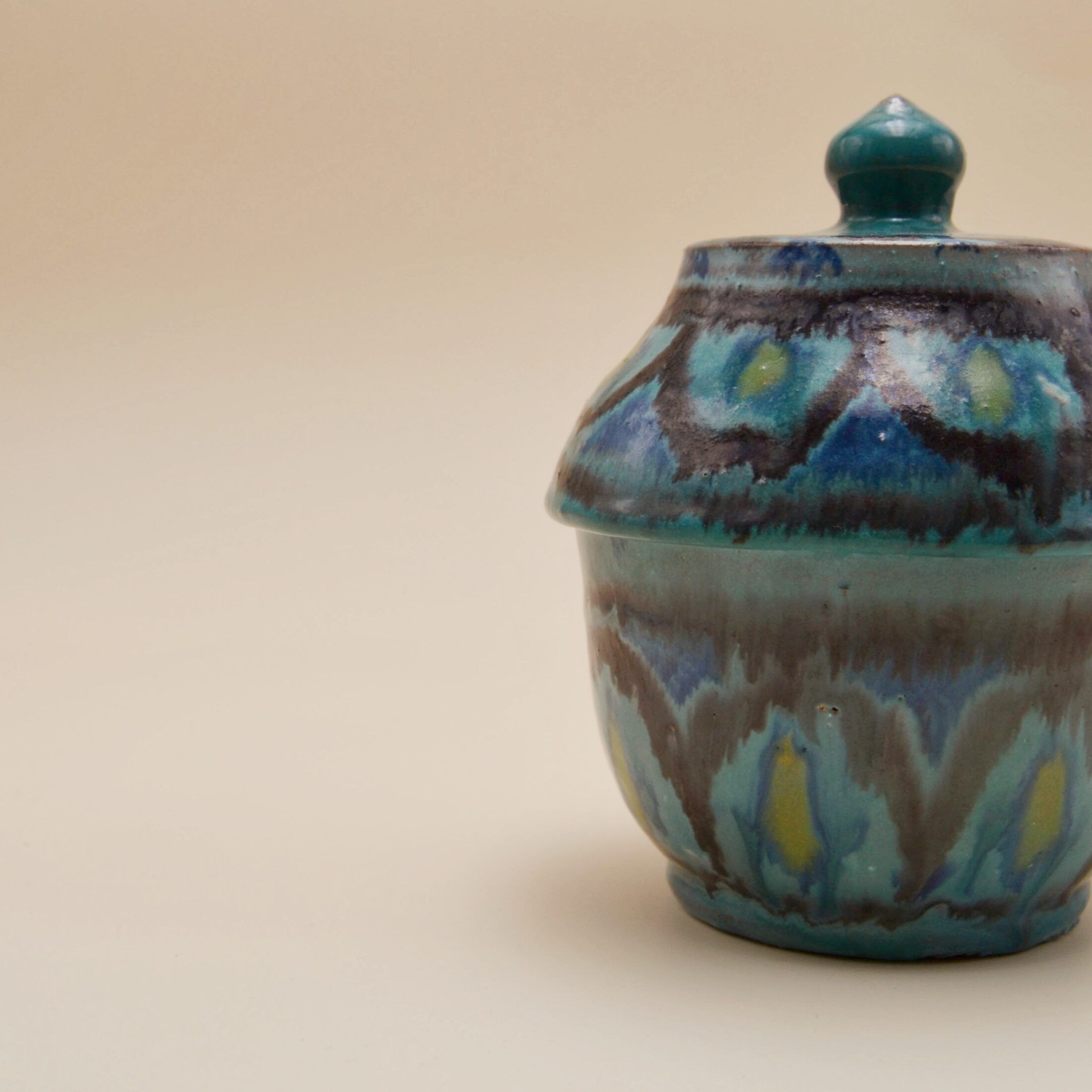 Sa glaçure aux nuances de bleu, turquoise et touches de jaune crée un motif presque végétal, comme une floraison en mouvement. Les formes douces et le couvercle à prise délicate renforcent son caractère chaleureux et fait main. Parfaite pour y glisser bijoux, épices ou petits trésors du quotidien, elle apporte une note décorative unique et inspirée.