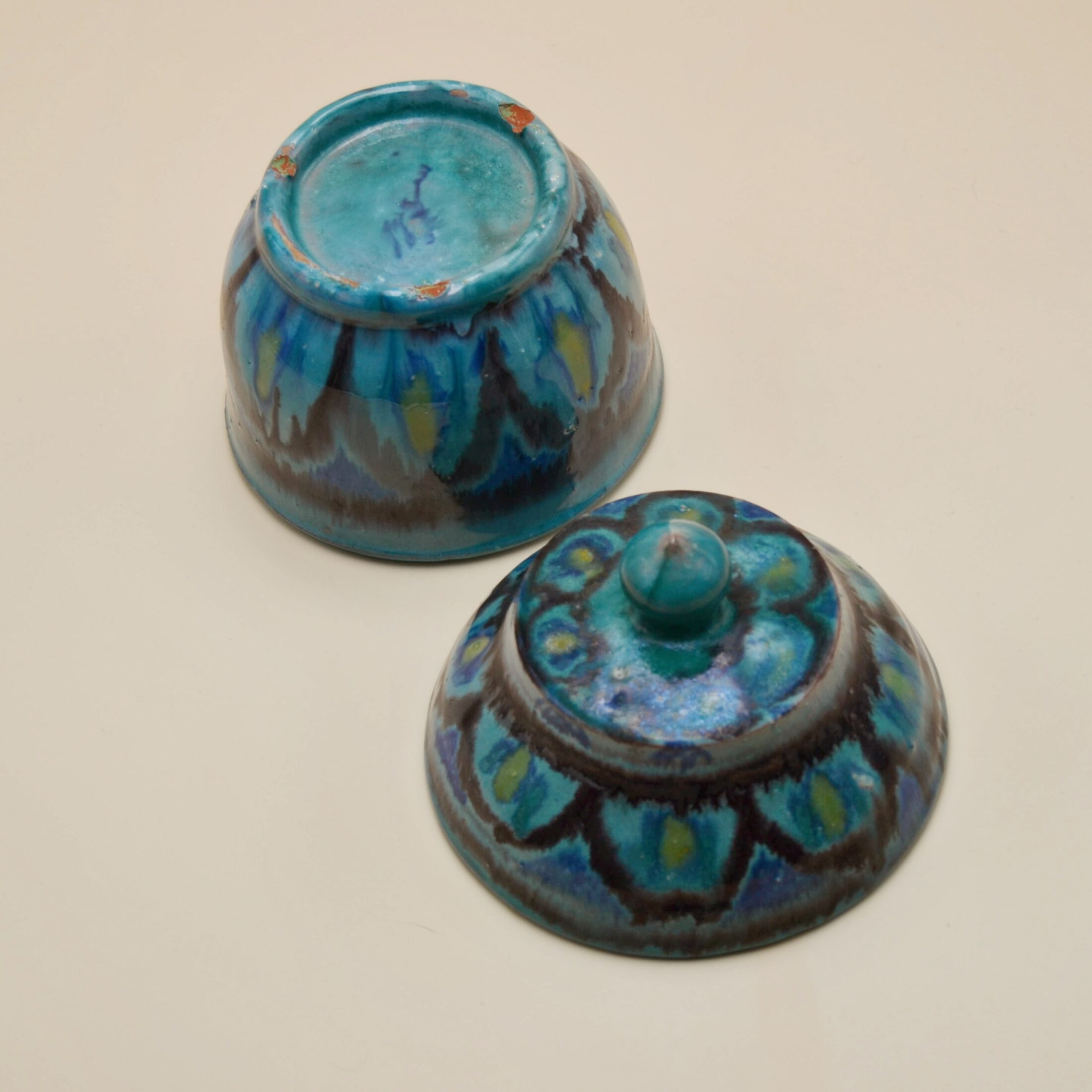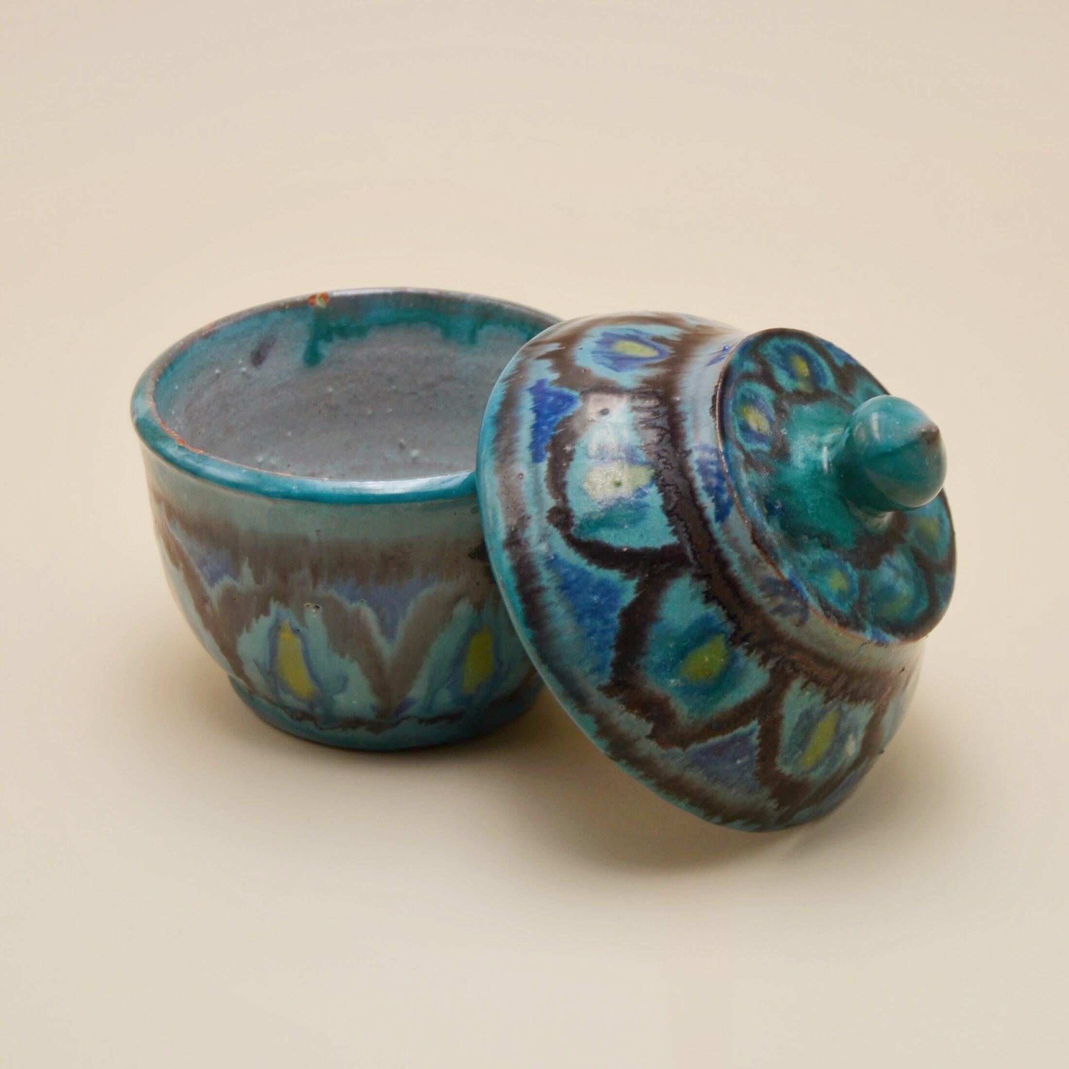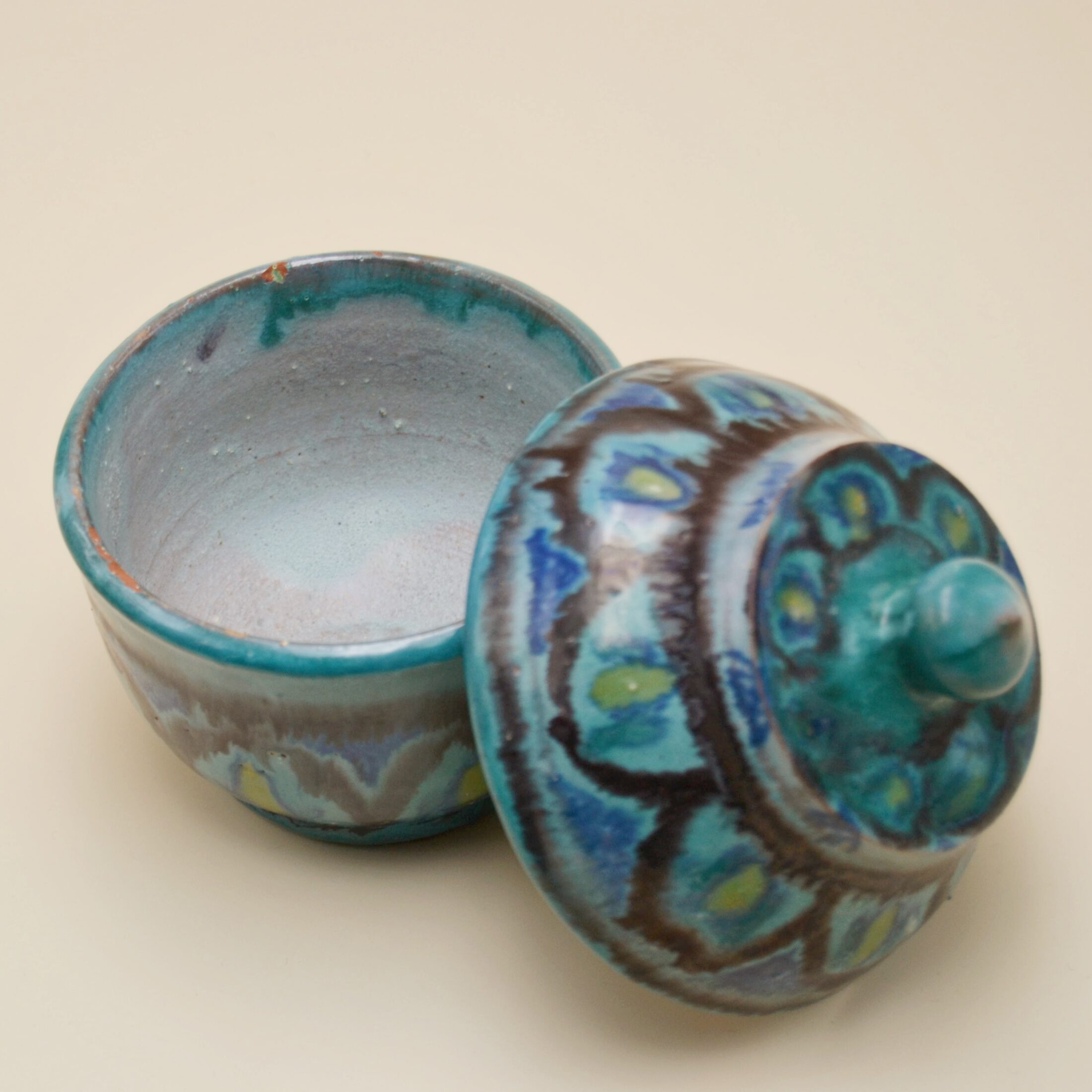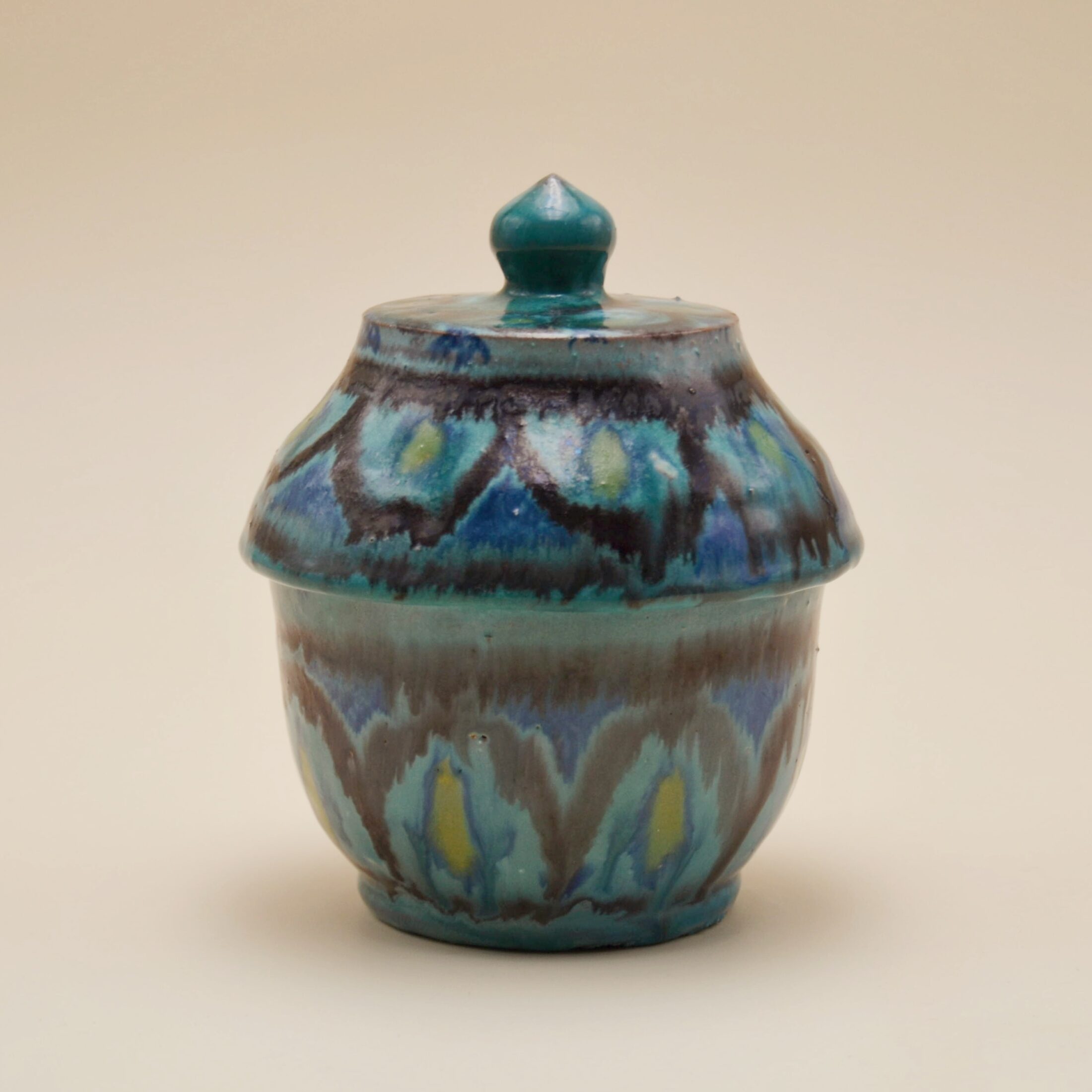 Sa glaçure aux nuances de bleu, turquoise et touches de jaune crée un motif presque végétal, comme une floraison en mouvement. Les formes douces et le couvercle à prise délicate renforcent son caractère chaleureux et fait main. Parfaite pour y glisser bijoux, épices ou petits trésors du quotidien, elle apporte une note décorative unique et inspirée.