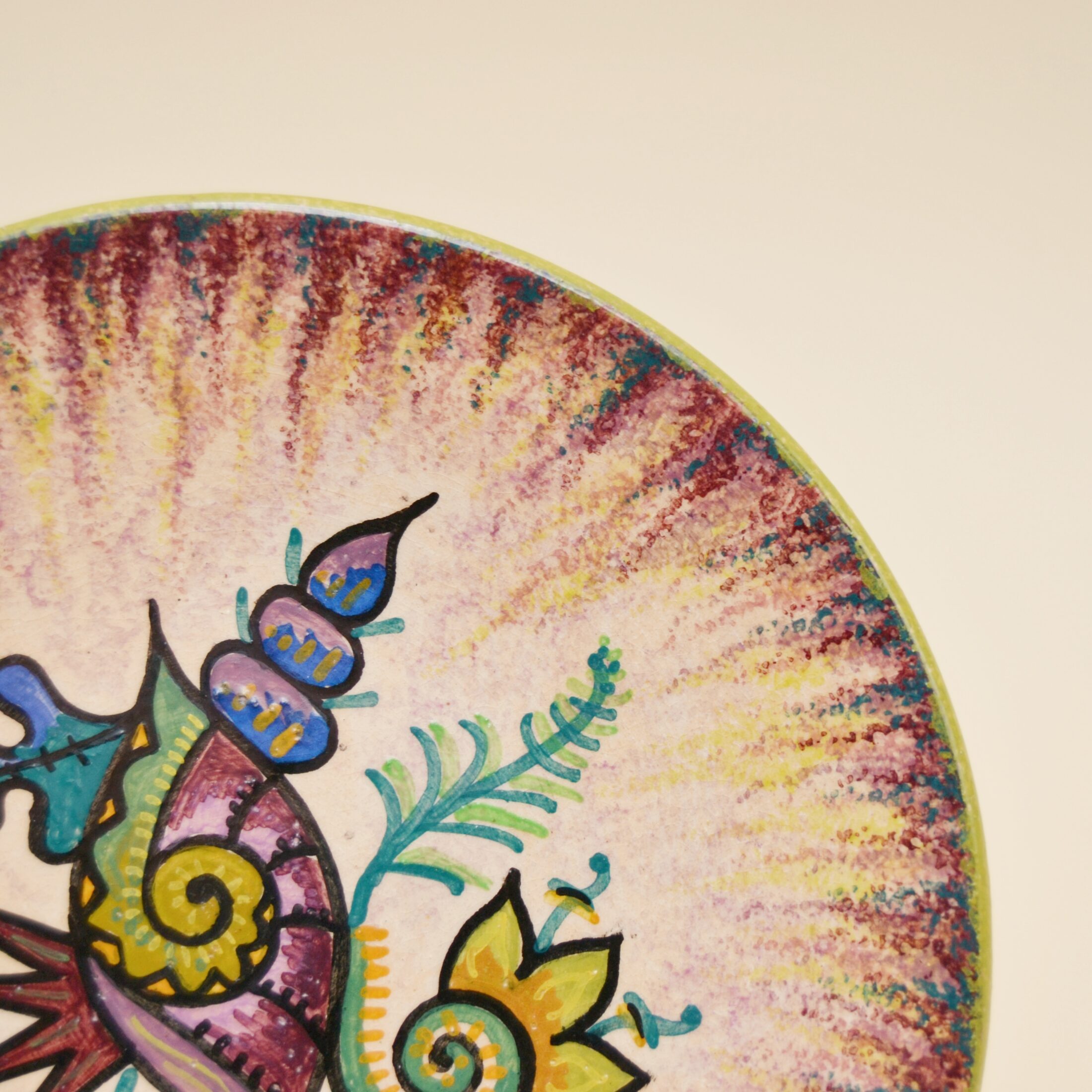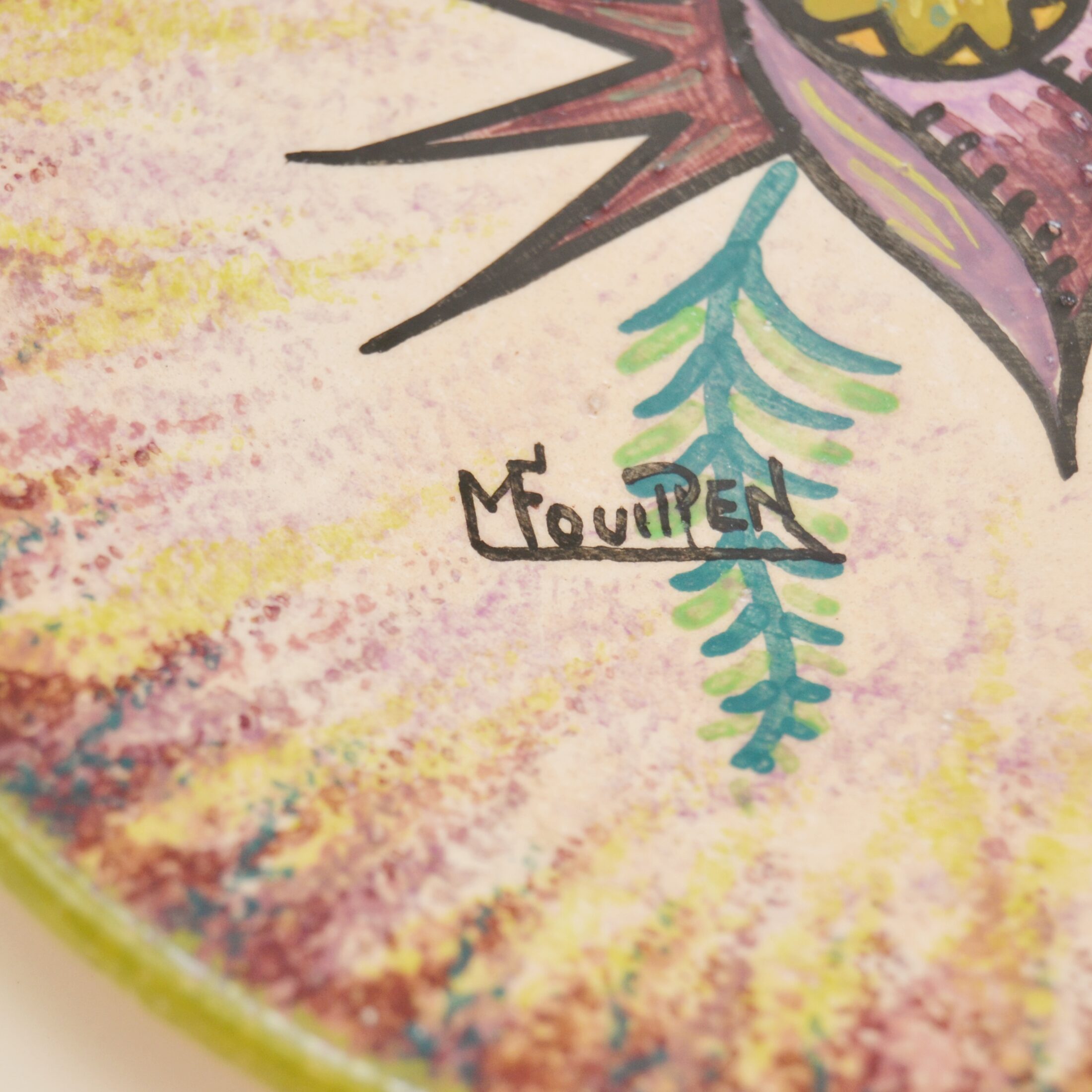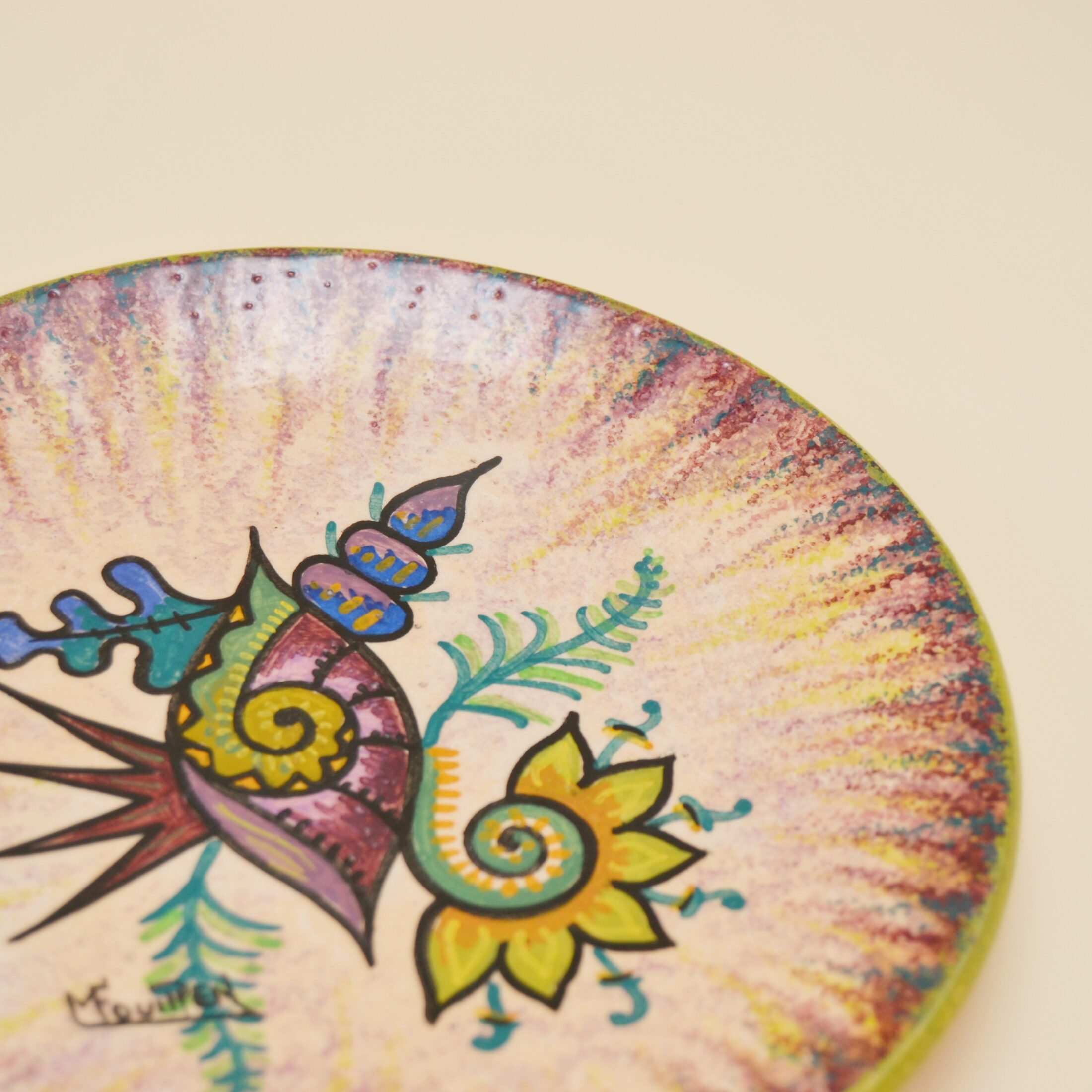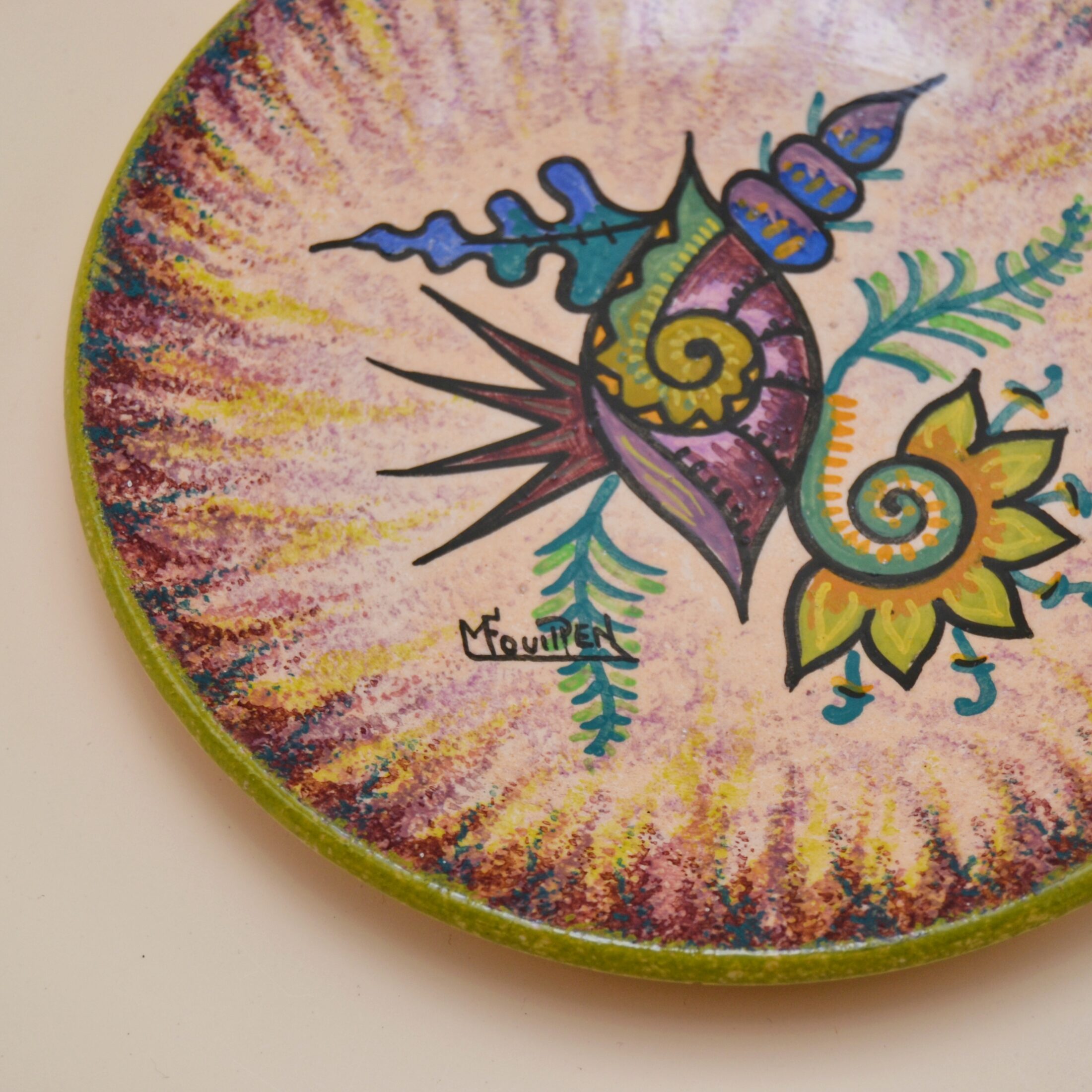 Pièce emblématique de la faïencerie bretonne, cette assiette séduit par ses motifs colorés et stylisés, typiques du travail de l’artiste. Le décor vibrant, peint à la main, s’épanouit sur un fond nuancé aux tons chauds, mettant en valeur la richesse des détails et la force graphique de la composition. Véritable objet de collection, elle apporte caractère et authenticité à une décoration murale ou à une table mise en valeur.