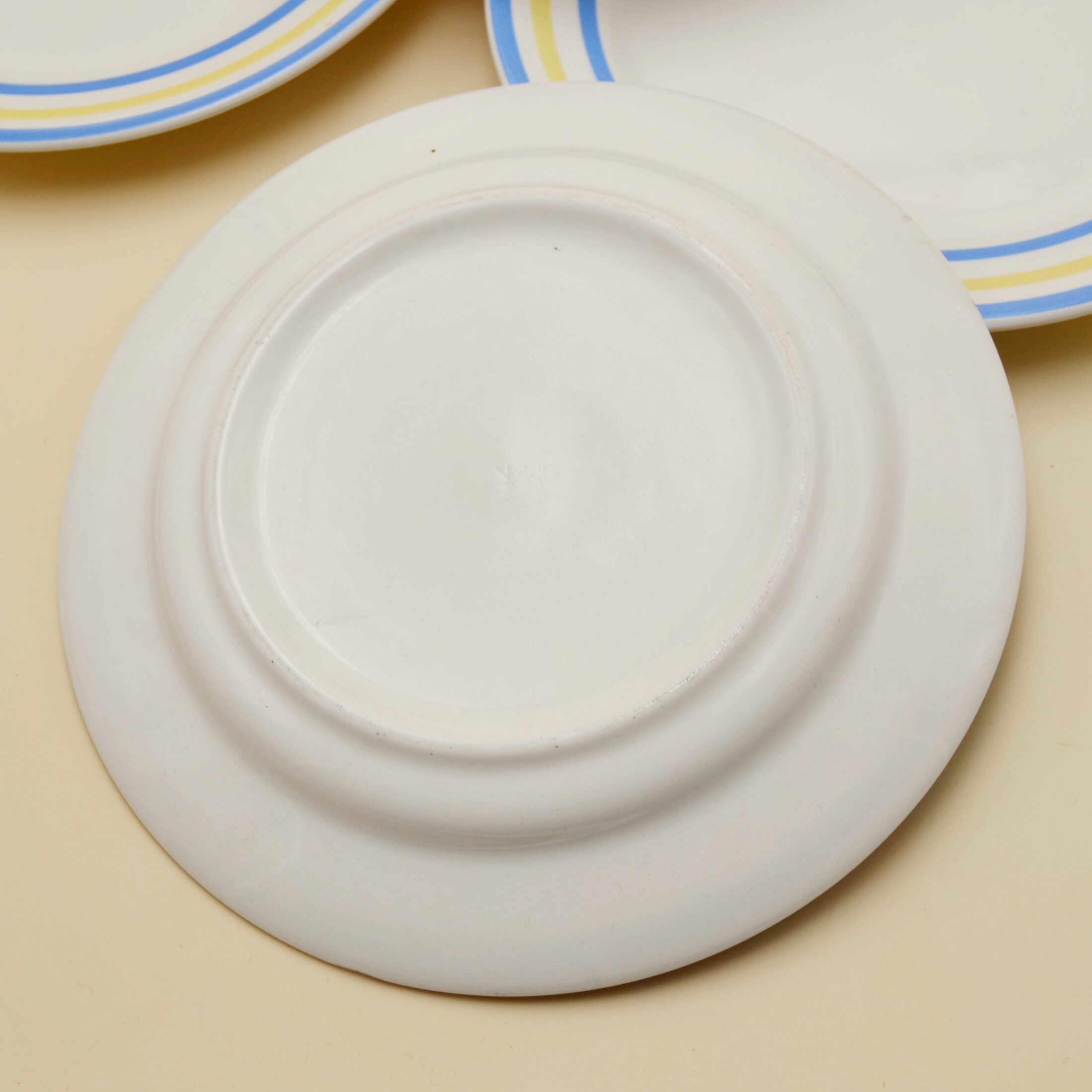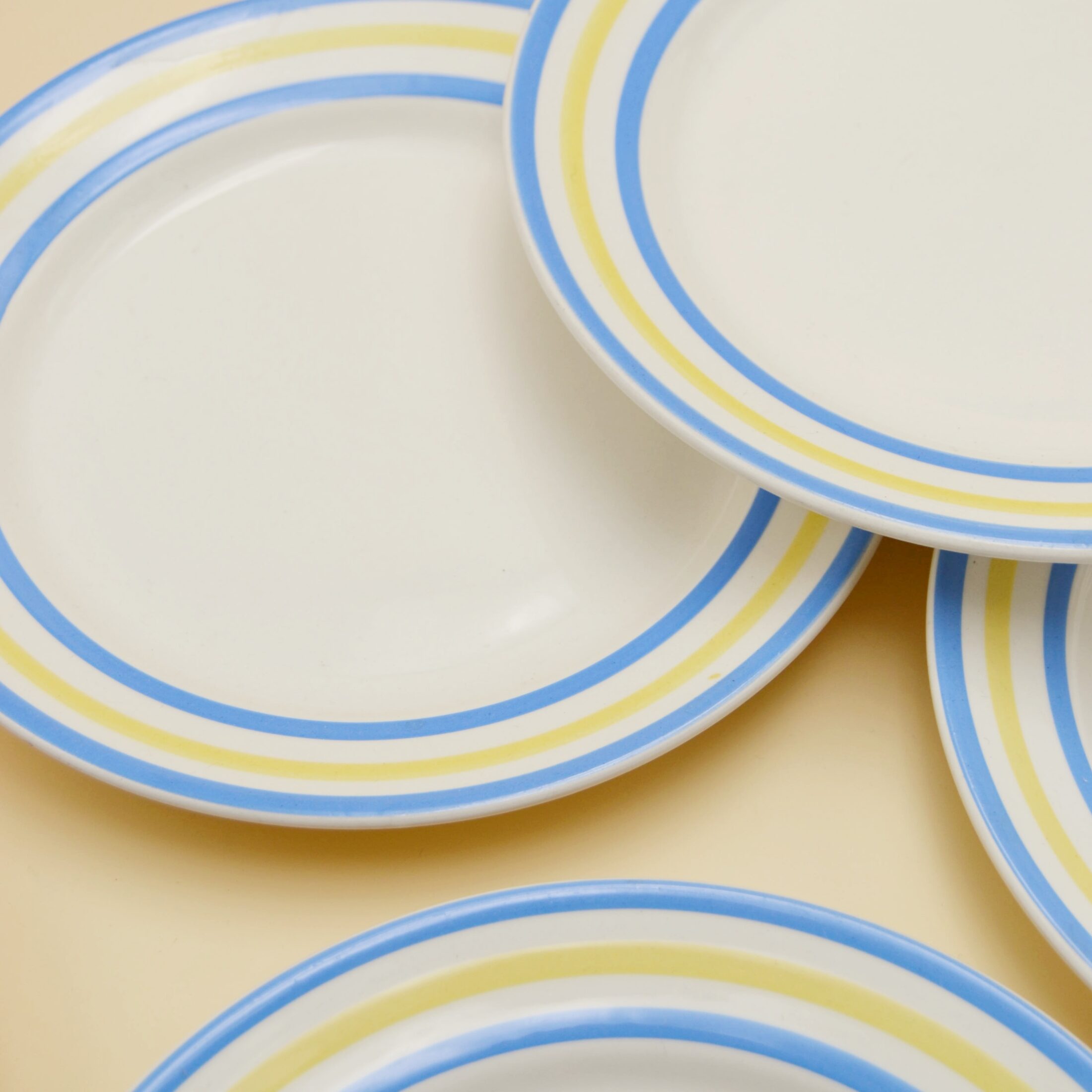 Leur bord est animé par un trio d’anneaux colorés — bleu tendre et jaune doux — qui contrastent joliment avec le fond blanc éclatant. Cette combinaison fraîche et ensoleillée apporte une touche de légèreté à la table, parfaite pour des goûters, brunchs ou desserts partagés. À la fois simples et pleines de caractère, ces assiettes insufflent une ambiance vintage joyeuse et conviviale à chaque moment gourmand.
