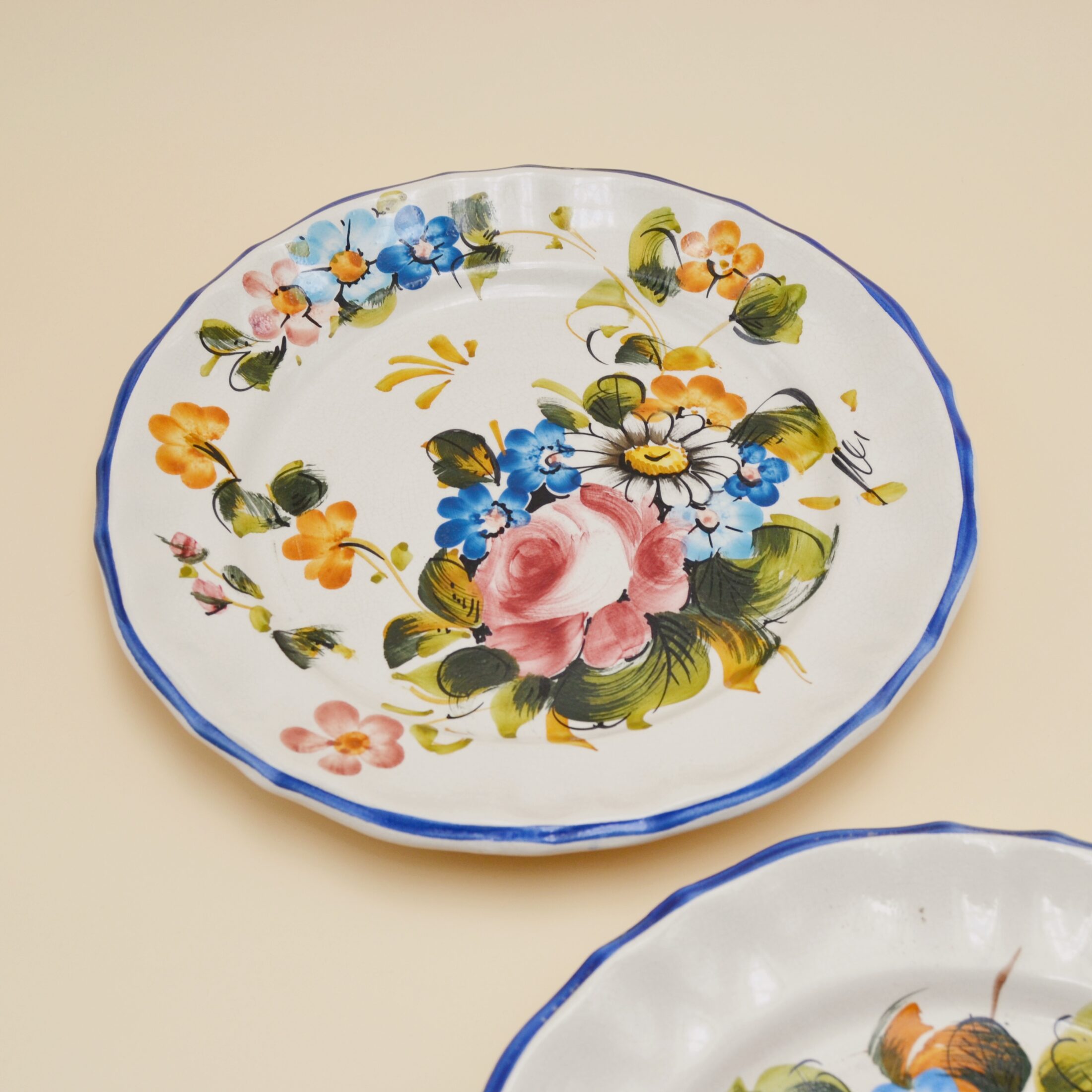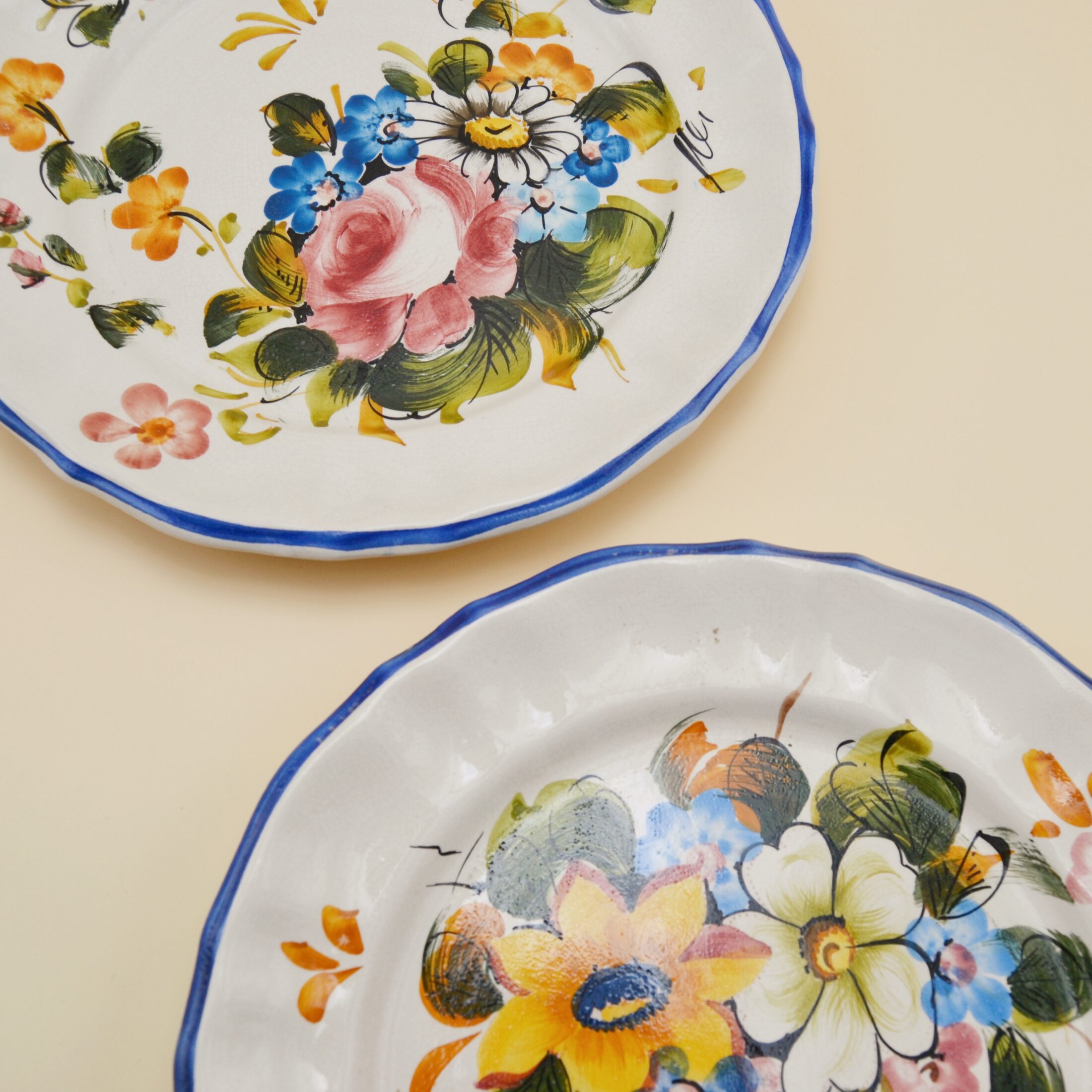 Réalisées en céramique italienne, ces assiettes se distinguent par leurs motifs floraux peints à la main aux couleurs éclatantes, bordés d’un fin liseré bleu. Leur relief légèrement festonné et leur décor généreux évoquent tout le savoir-faire artisanal de Bassano, réputé pour ses pièces décoratives riches en détails. Idéales pour habiller un mur, une étagère ou une table avec caractère et poésie.