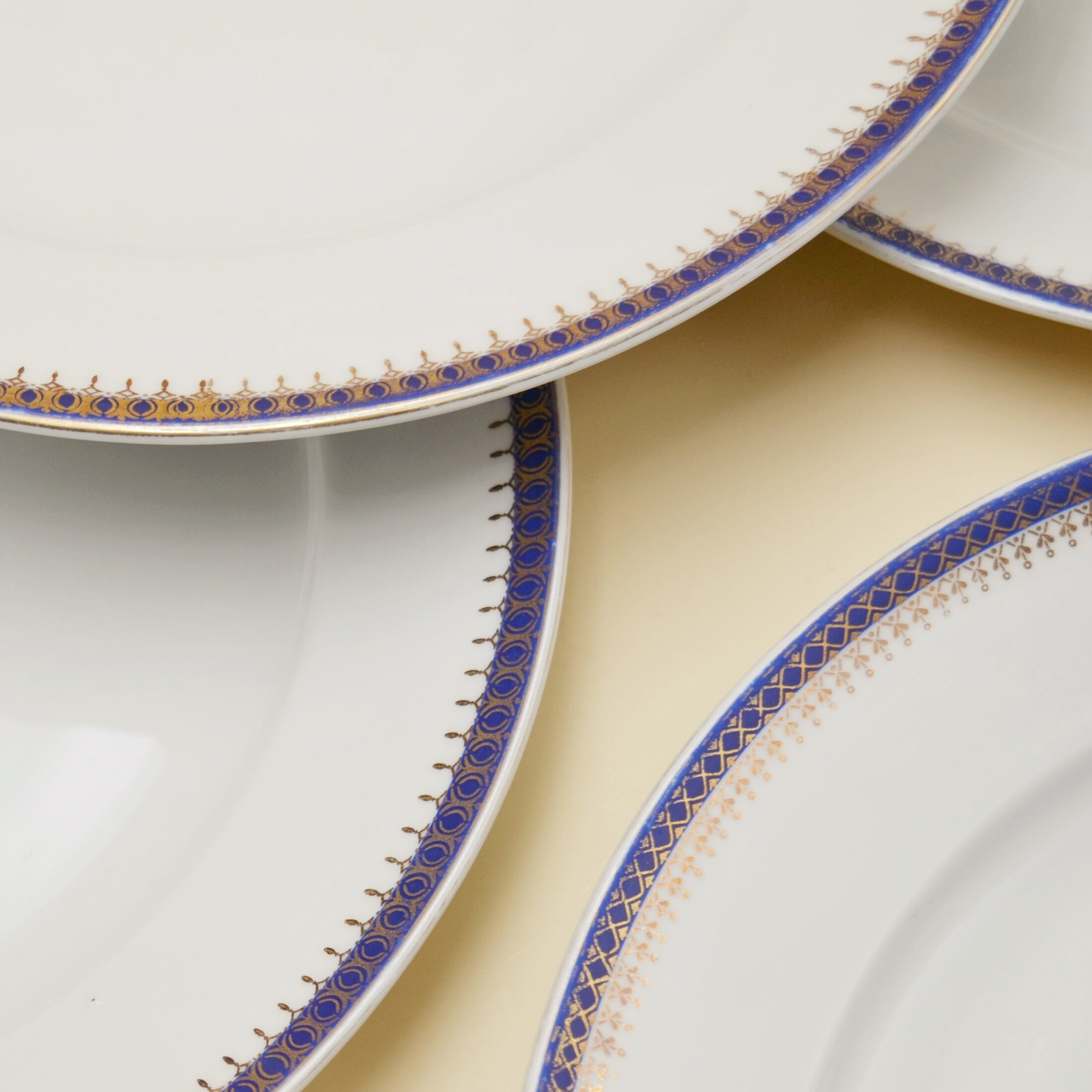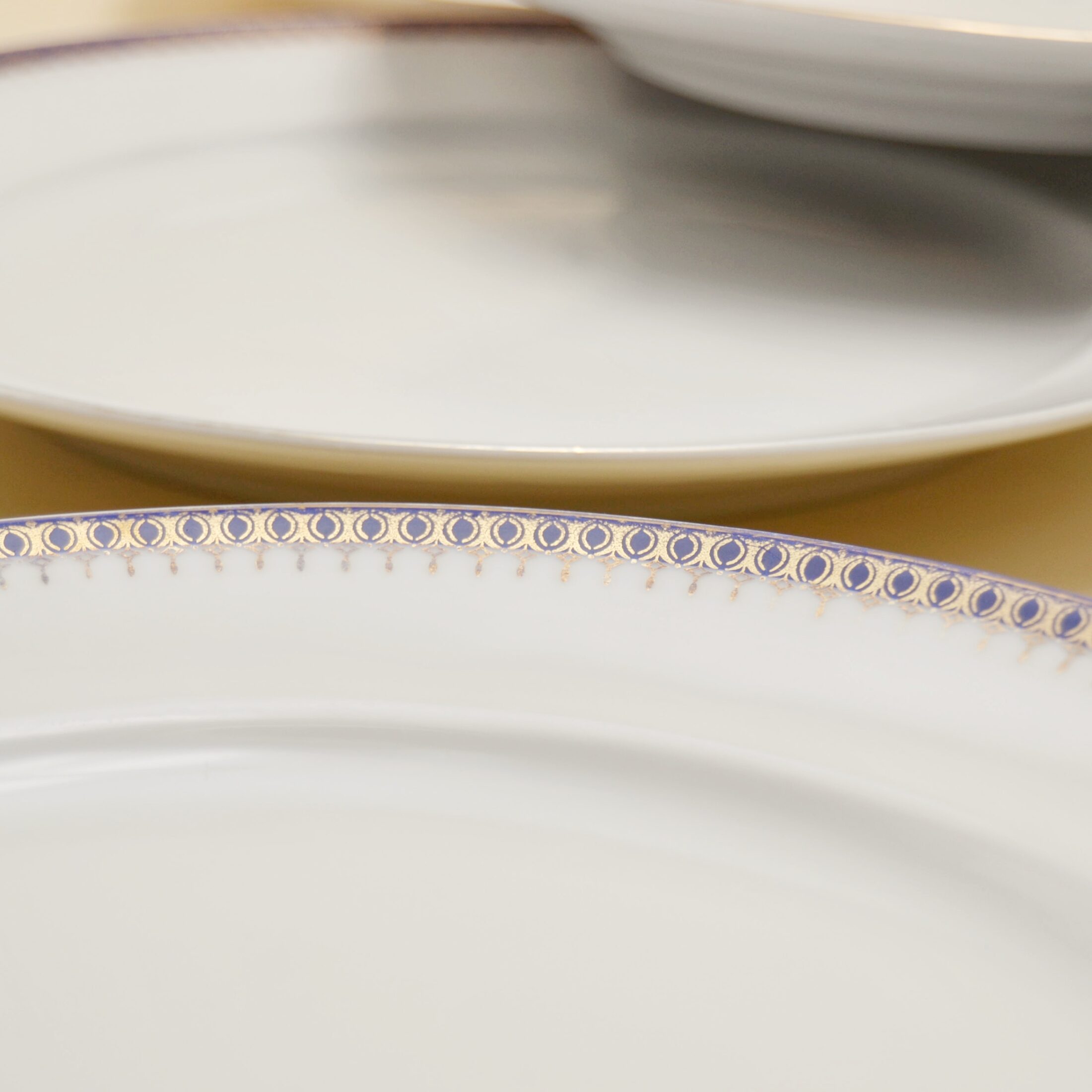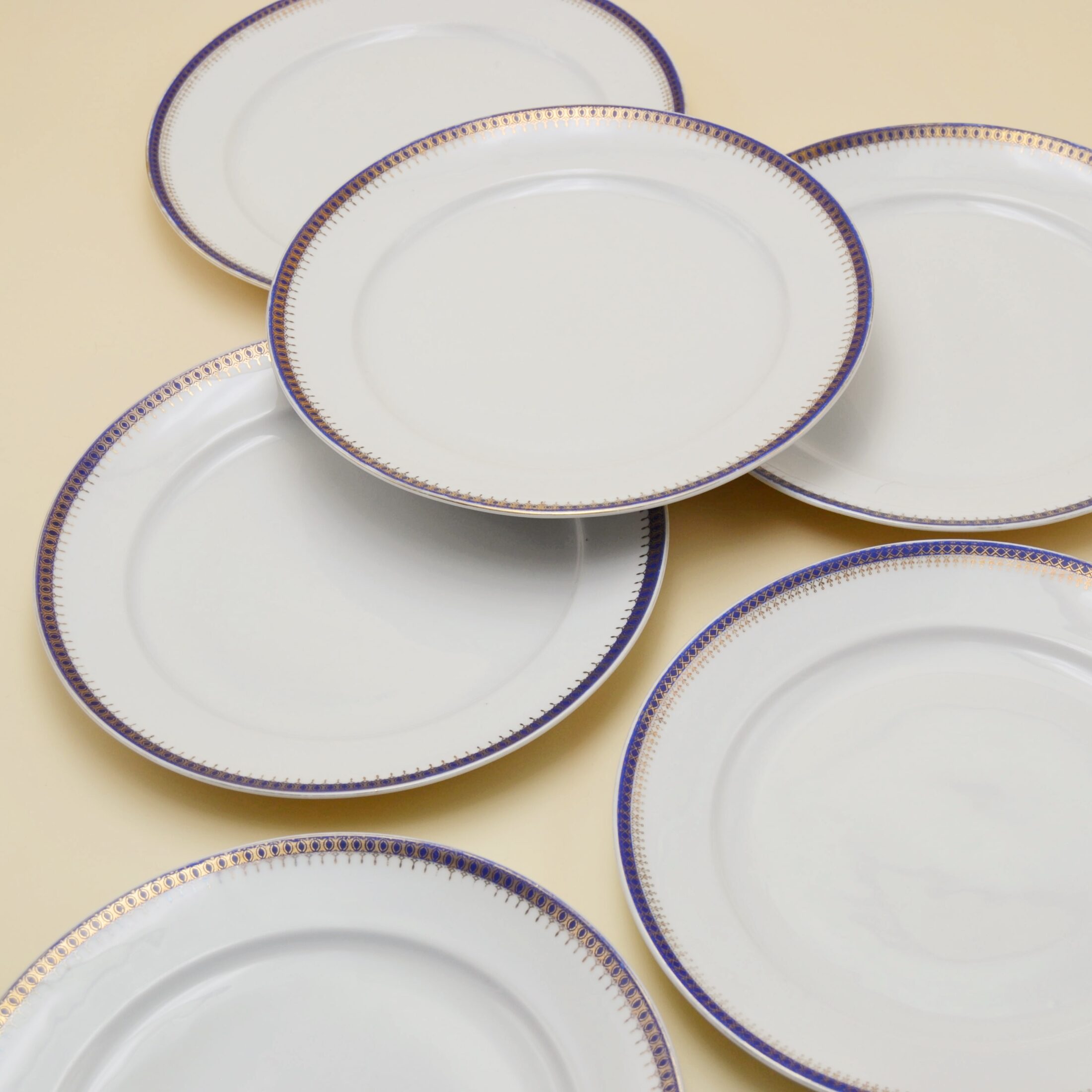 ✨ Élégantes assiettes plates signées Winterling, soulignées d’un fin liseré bleu et de délicats détails dorés.