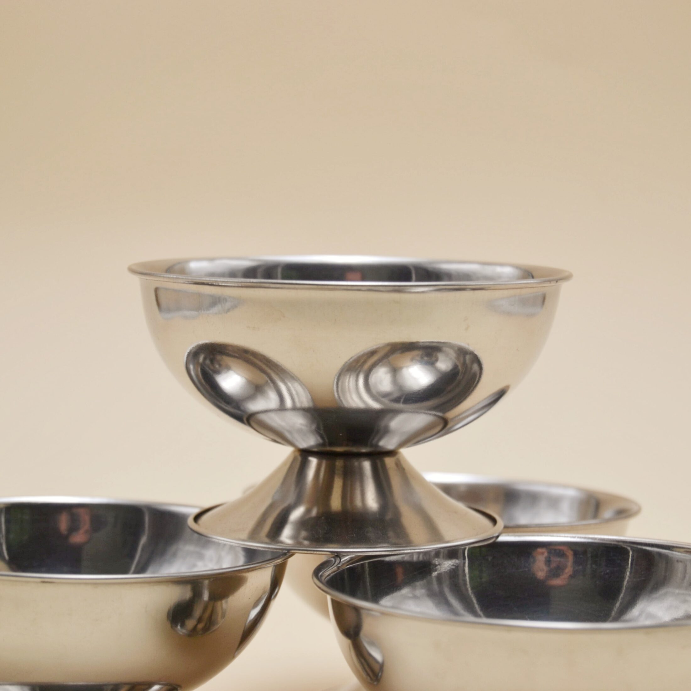 Réalisées en métal chromé, ces petites coupes sur pied séduisent par leur brillance et leur allure rétro. Polyvalentes, elles peuvent accueillir fruits secs, amuse-bouches, desserts ou simplement être utilisées en décoration. Leur silhouette élégante et leur fini miroir en font des pièces à la fois pratiques et décoratives, parfaites pour apporter une note vintage chic à vos moments de convivialité.