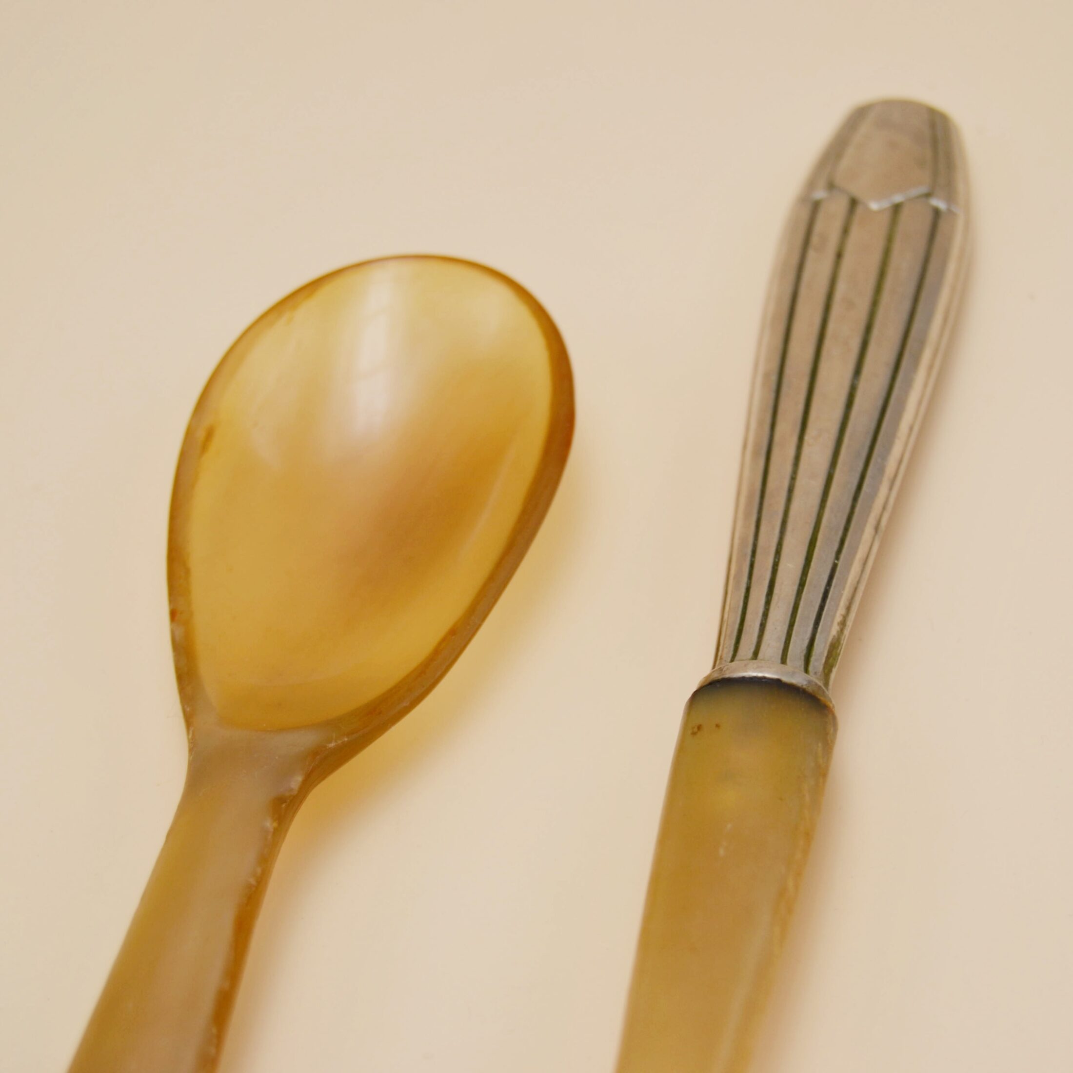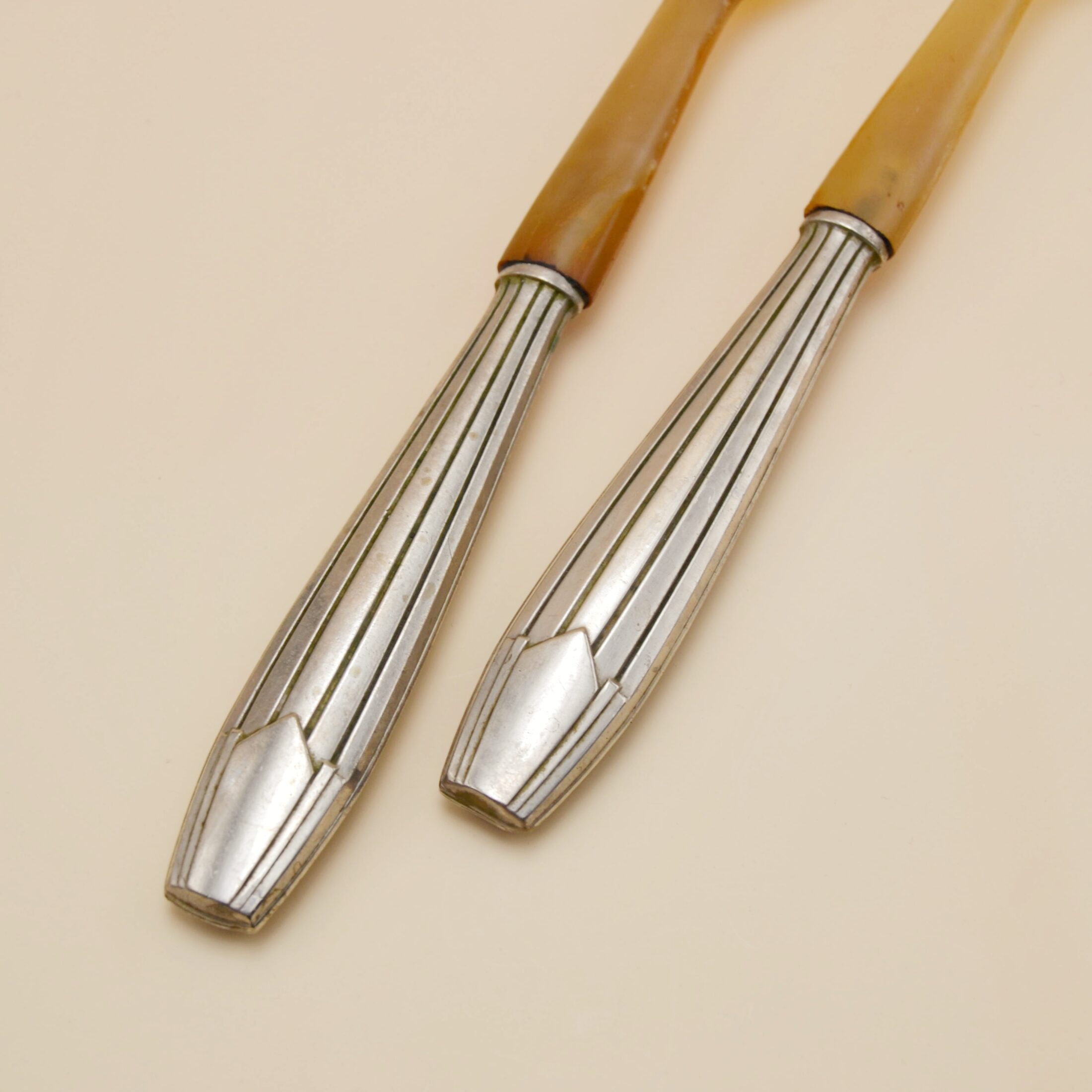 Alliant métal argenté et bakélite miel, ils séduisent par leur ligne élégante et leurs finitions typiques des années 50. Le contraste entre la brillance du métal et la douceur ambrée des manches apporte une touche rétro pleine de caractère. Véritables témoins du savoir-faire d’autrefois, ils subliment la table avec authenticité et style.