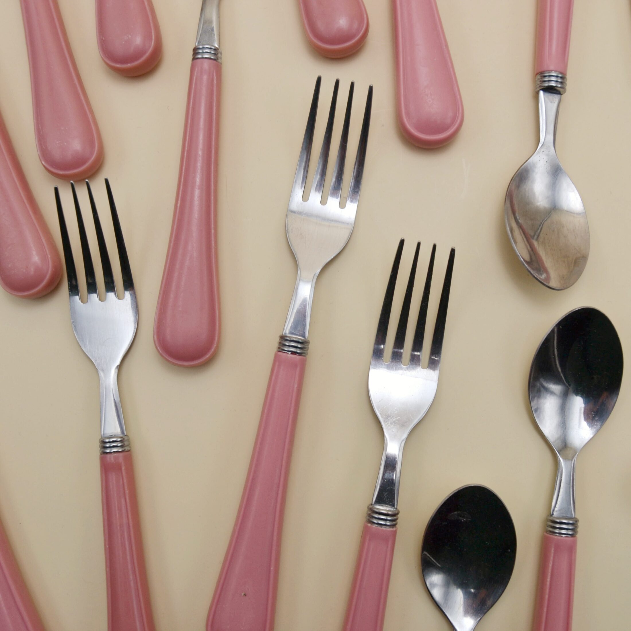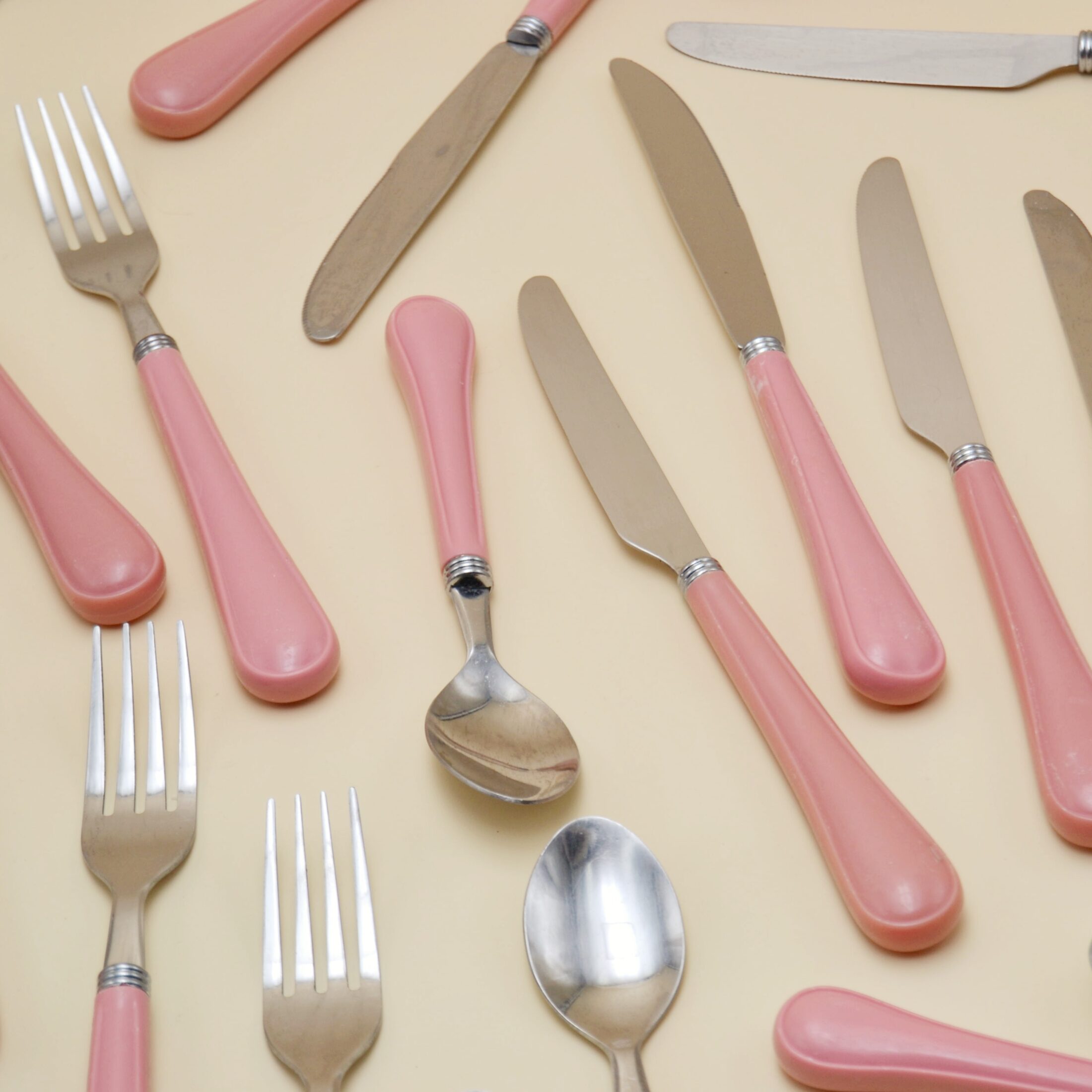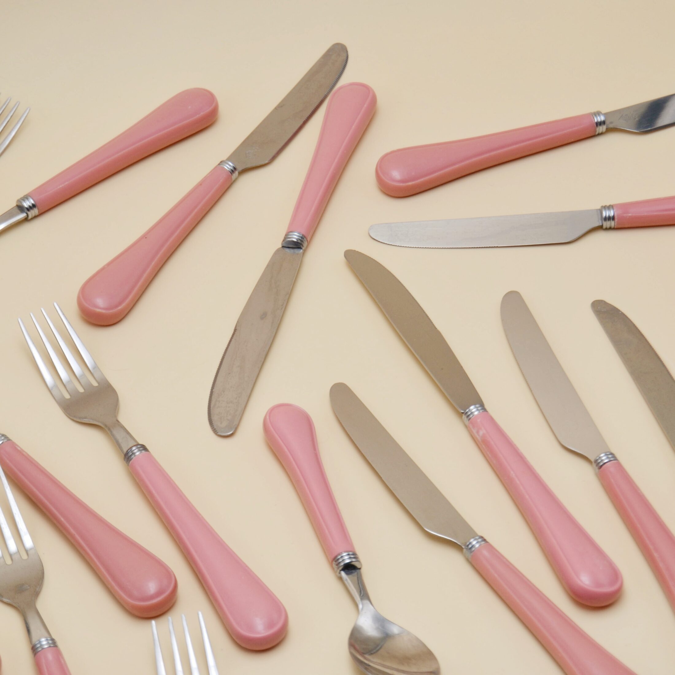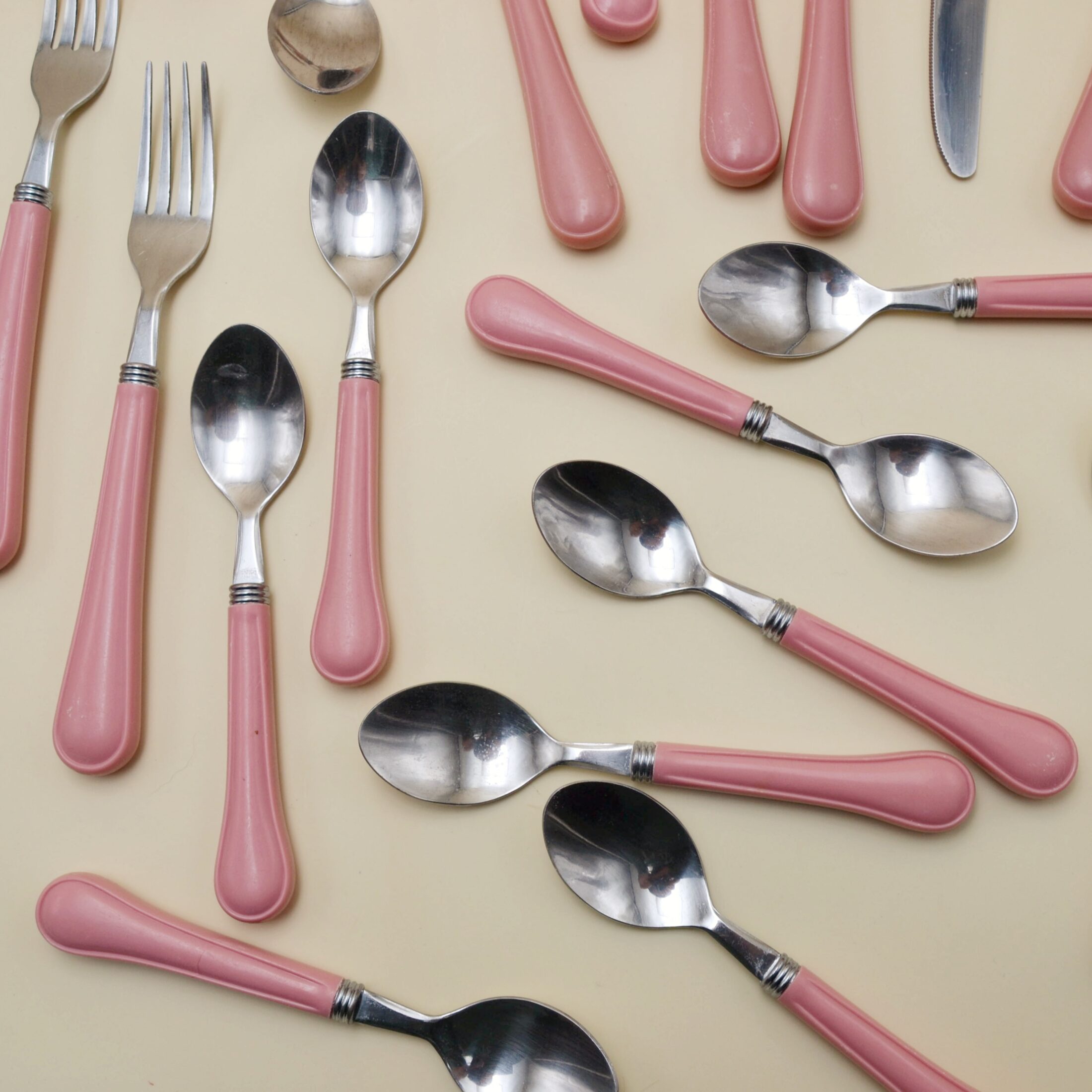 ✨ Ensemble de couverts vintage en plastique rose et inox, un mix parfait de simplicité et de charme rétro.