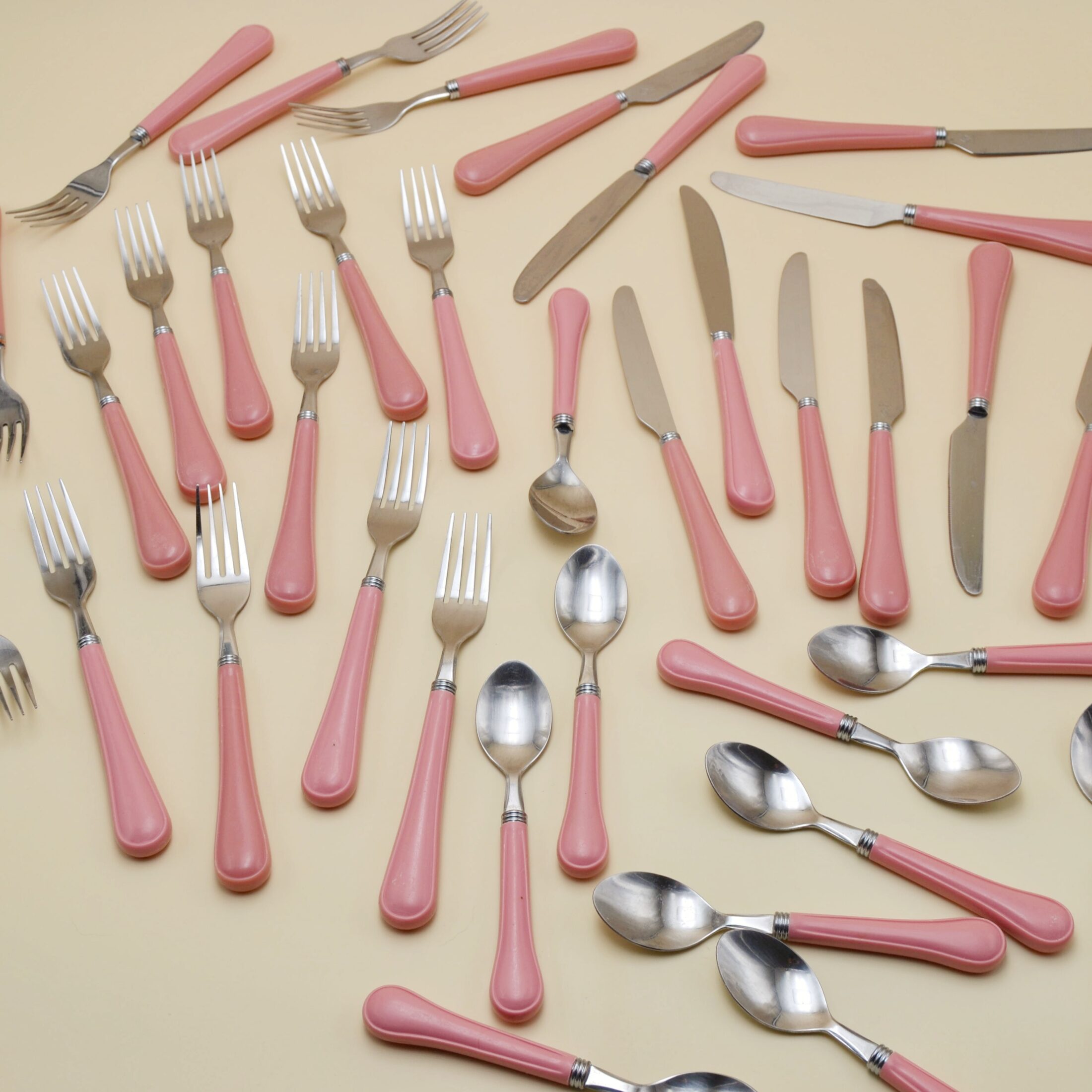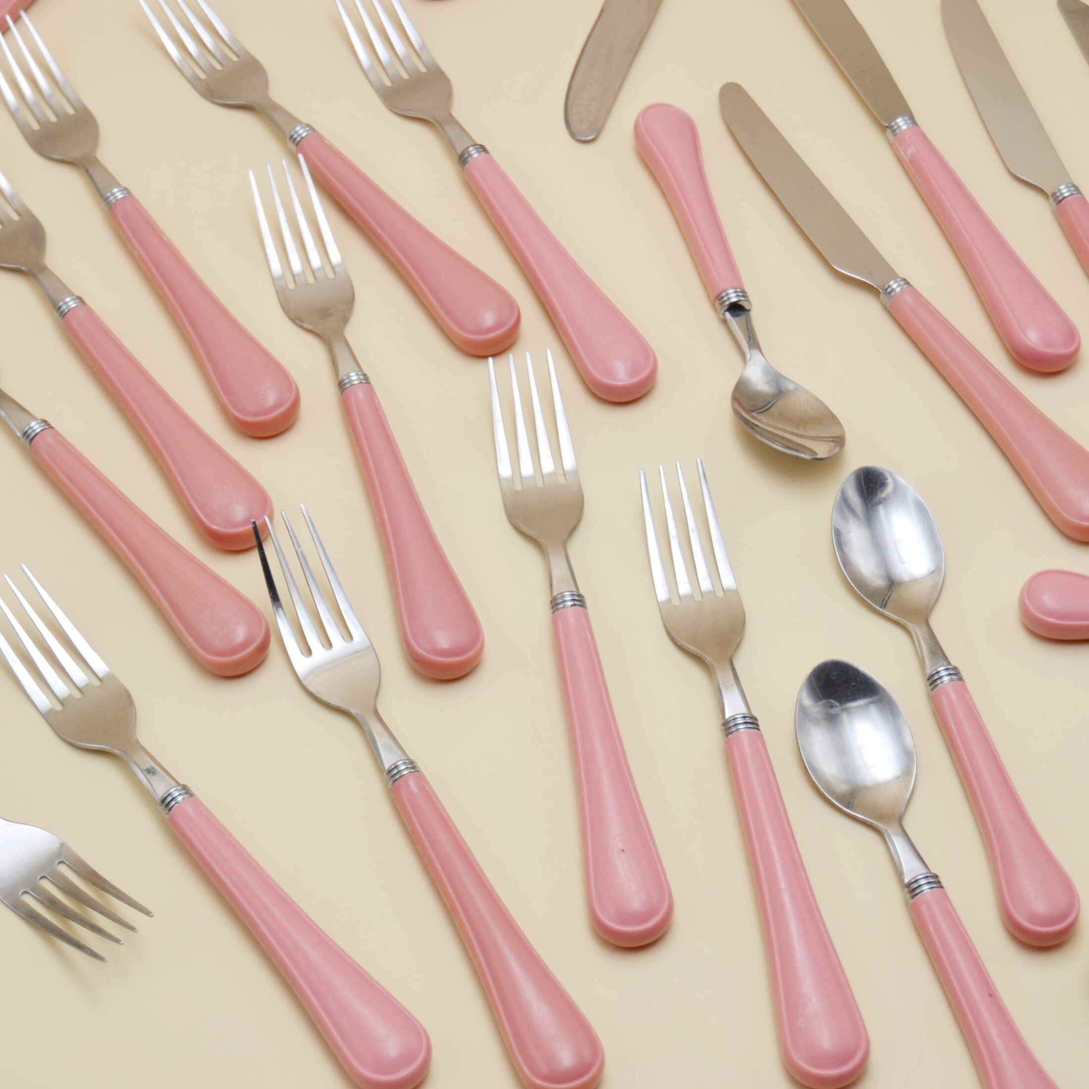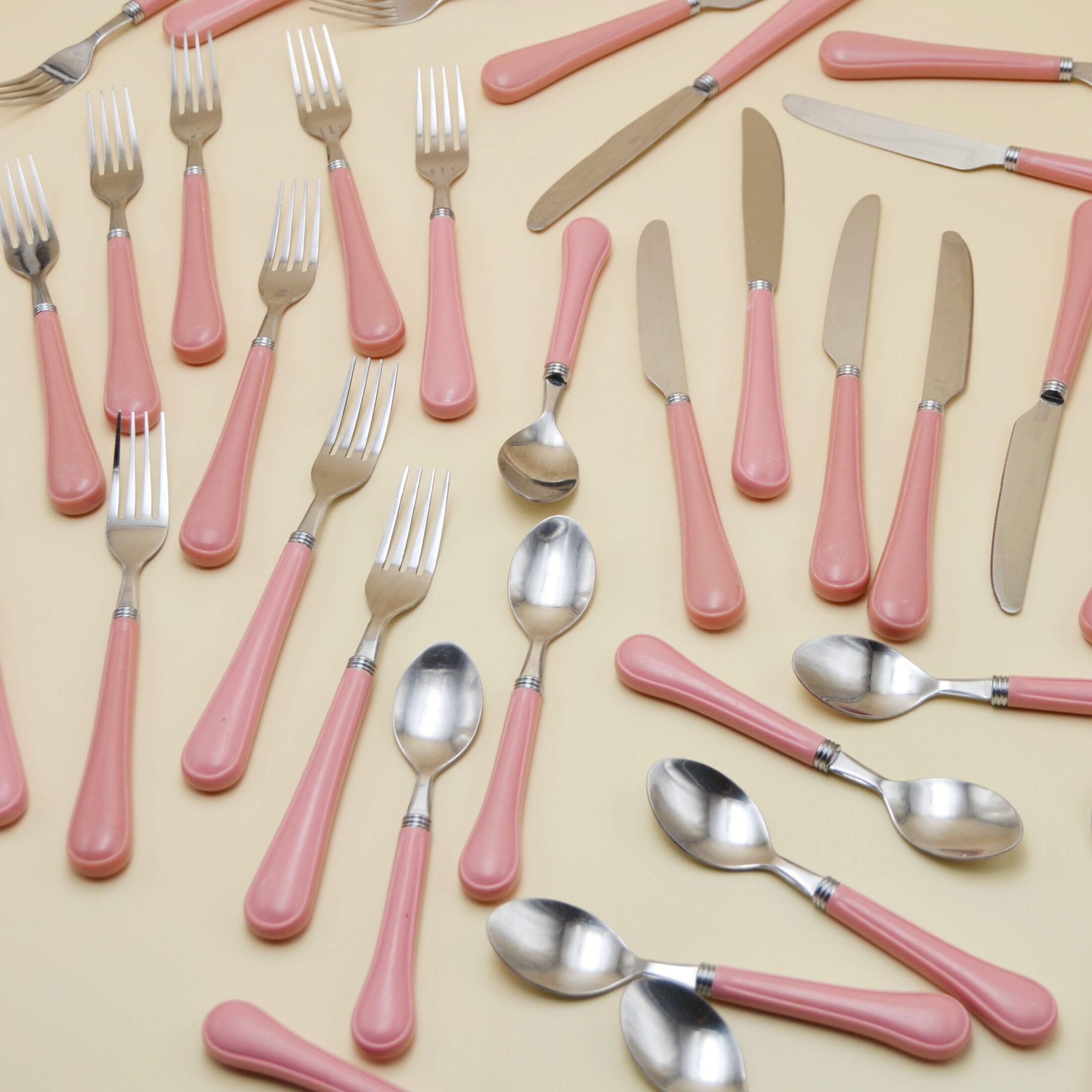 ✨ Ensemble de couverts vintage en plastique rose et inox, un mix parfait de simplicité et de charme rétro.