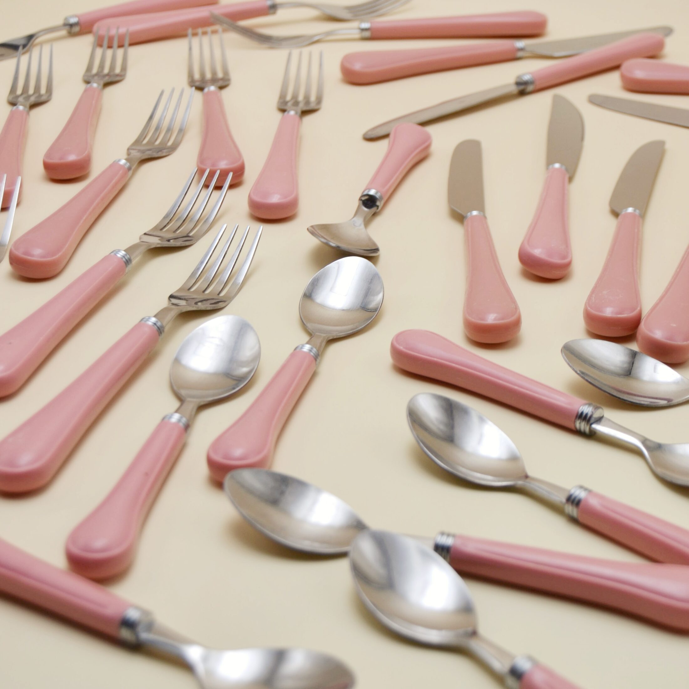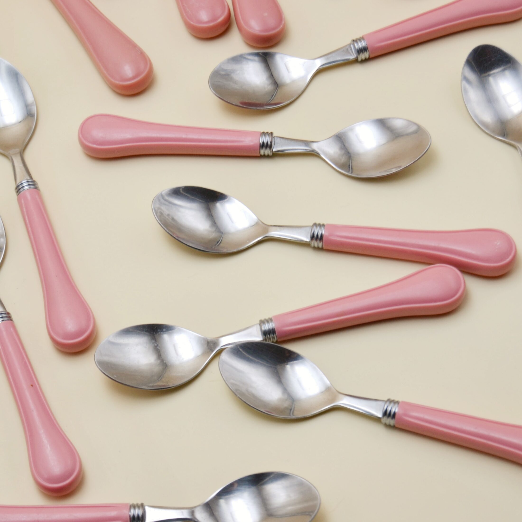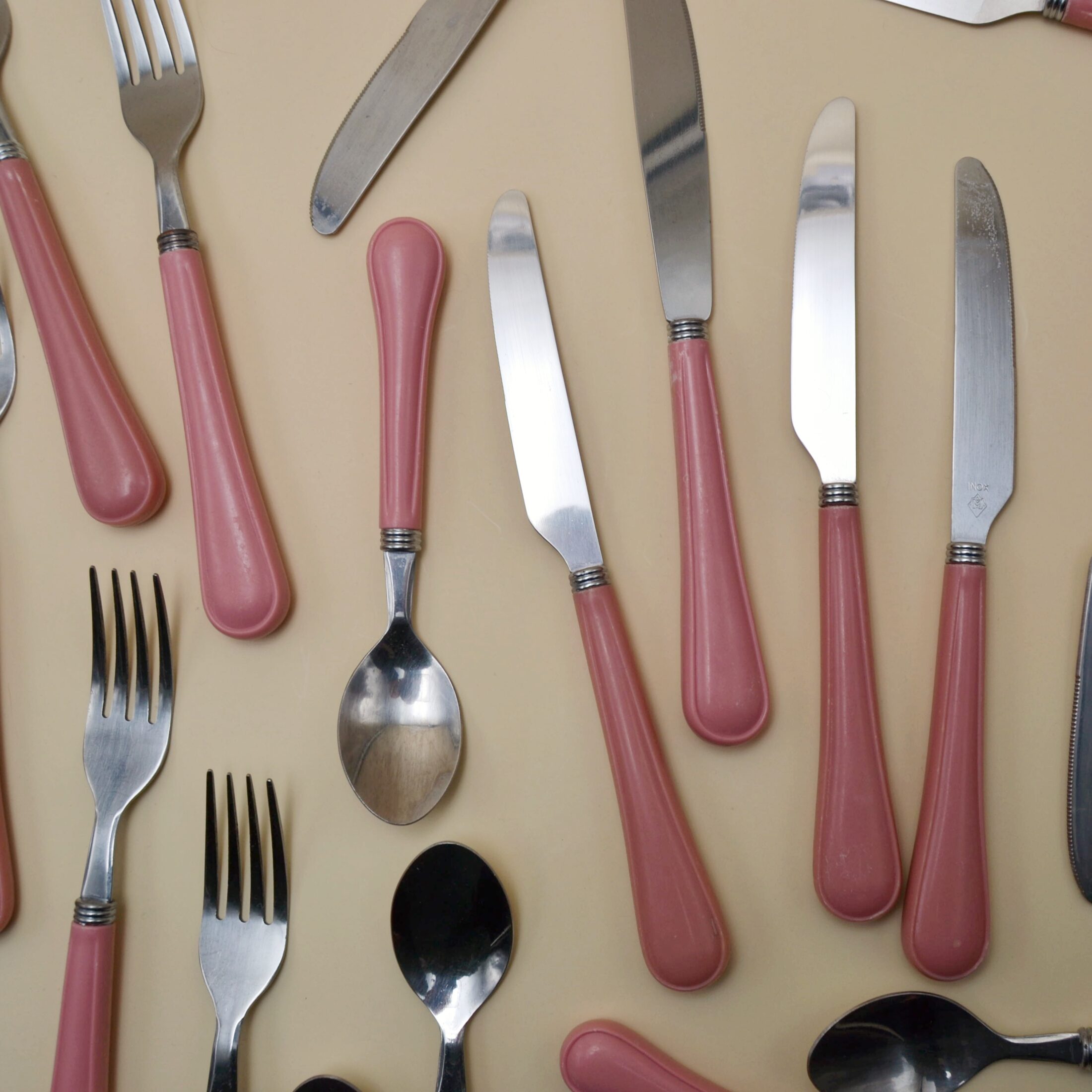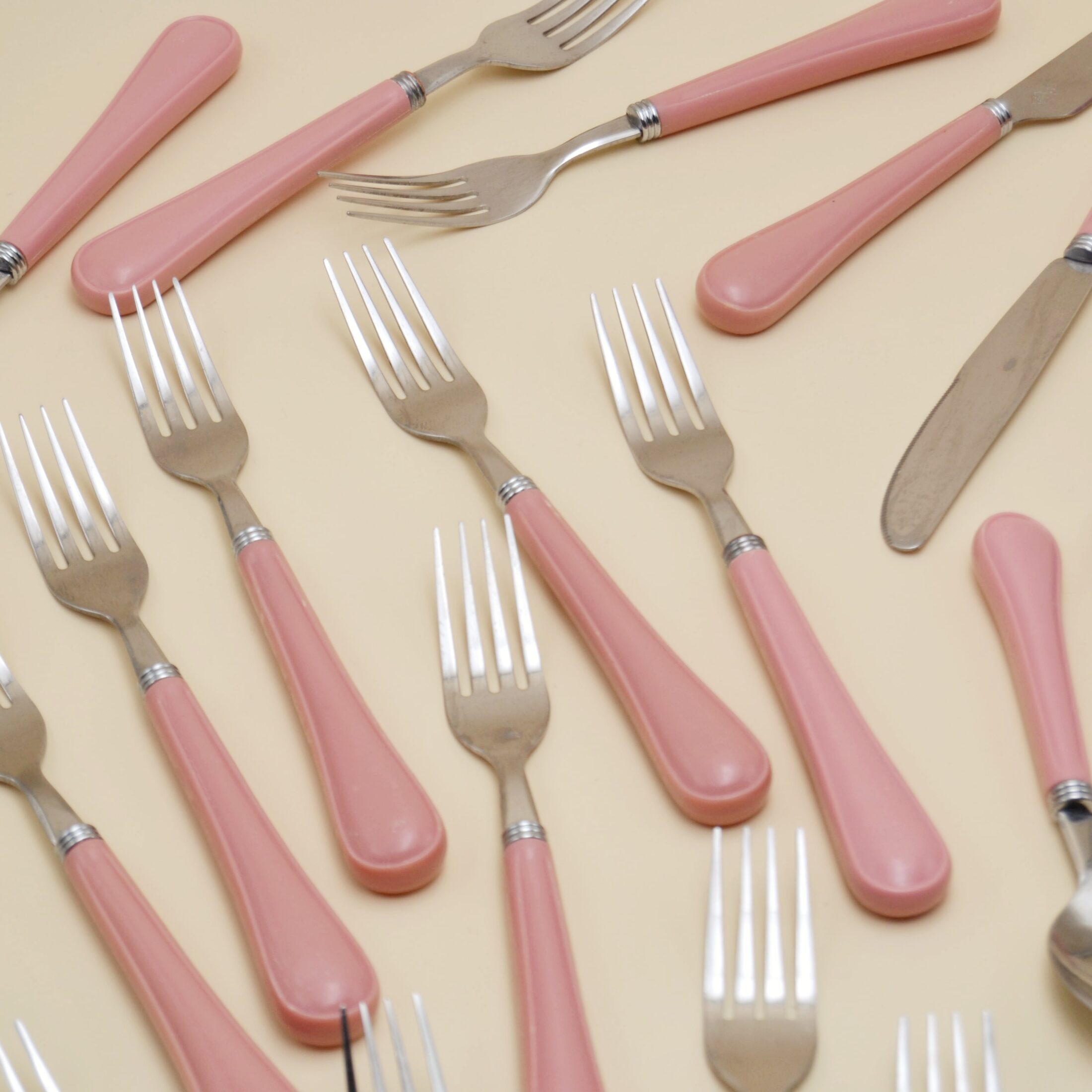 ✨ Ensemble de couverts vintage en plastique rose et inox, un mix parfait de simplicité et de charme rétro.