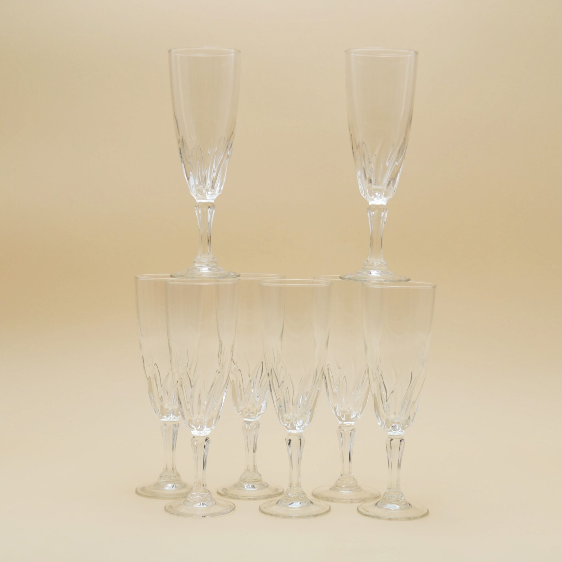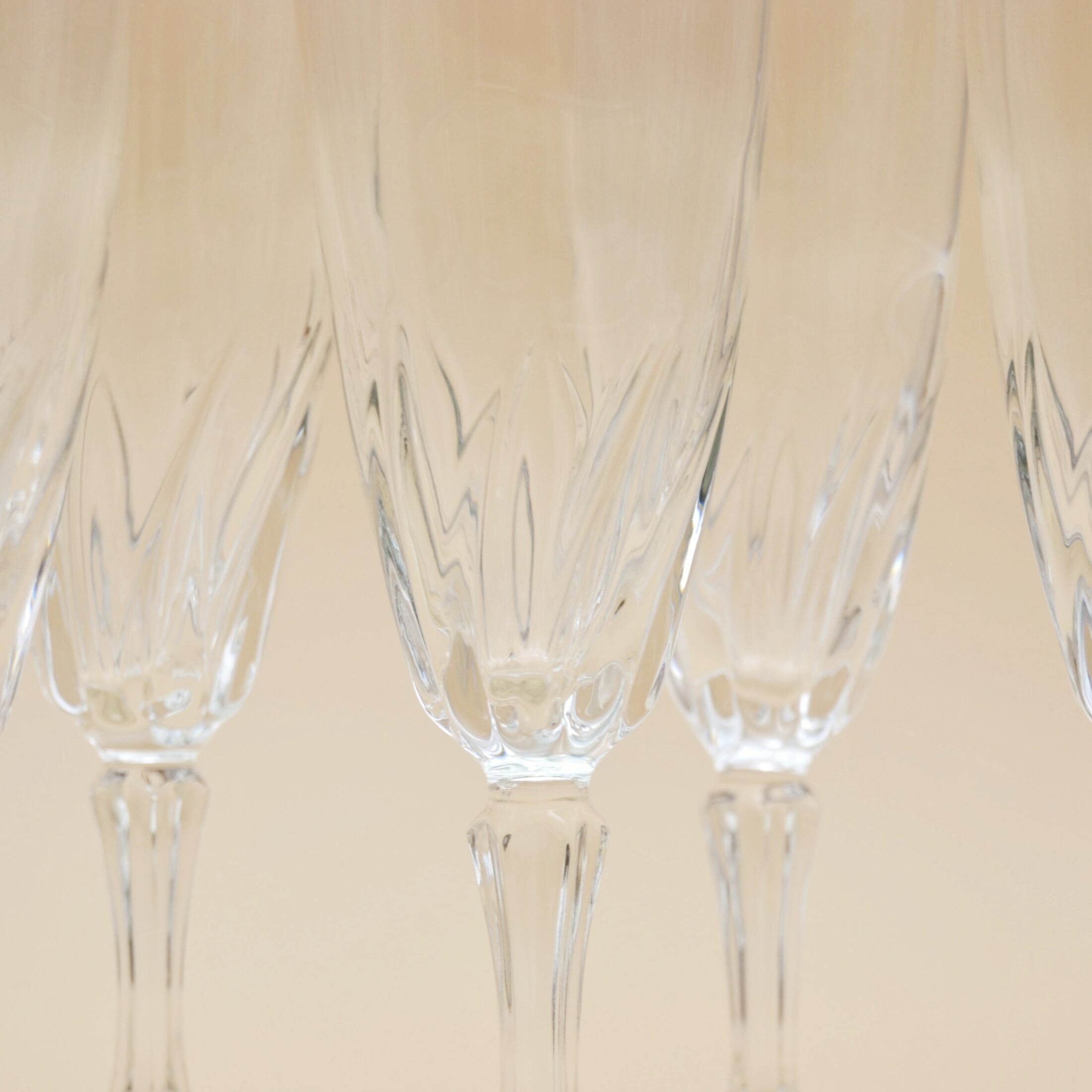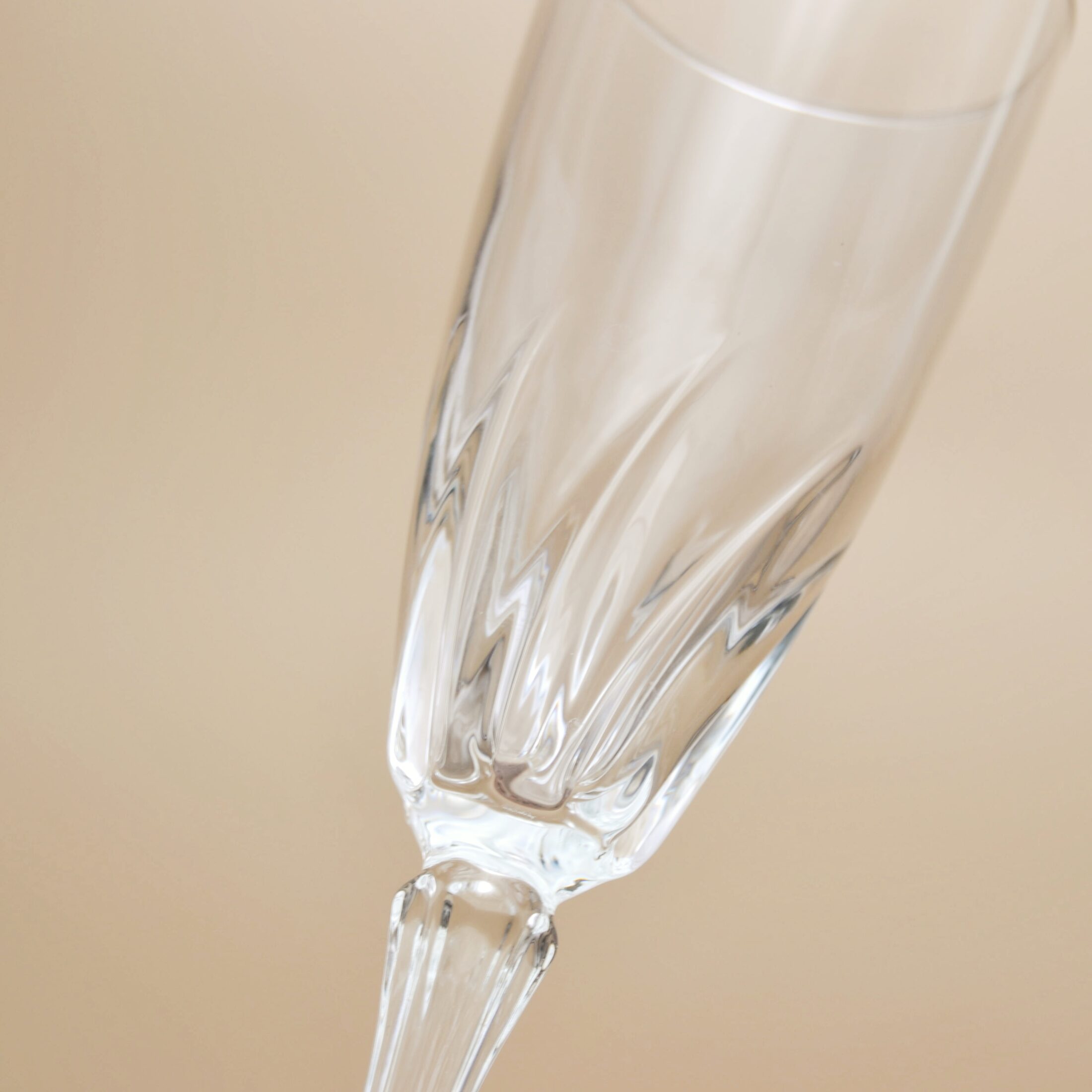 Elles se distinguent par leur pied élancé et fin, qui leur confère une allure élégante, ainsi que par le bas du contenant délicatement tourné, créant de subtils reflets lorsque la lumière s’y pose. Leur silhouette gracieuse met en valeur les bulles et sublime chaque dégustation. Parfaites pour célébrer les grandes occasions ou apporter une note chic à une table, ces flûtes allient finesse vintage et élégance sobre avec justesse.